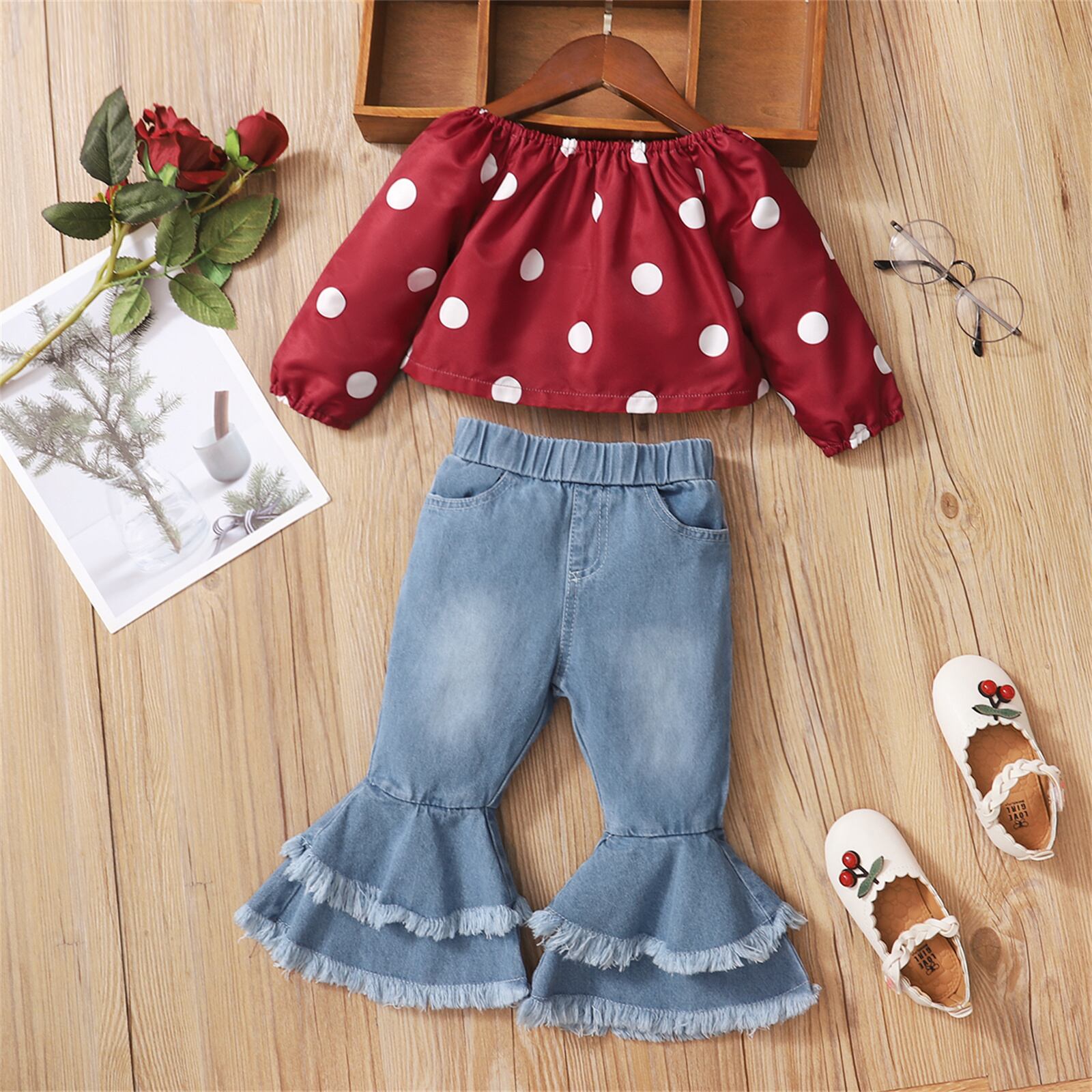 新作 PatPat Baby 2pcs ポルカドット レッド オフショルダー ロングスリーブ トップとフレア ジーンズ セット