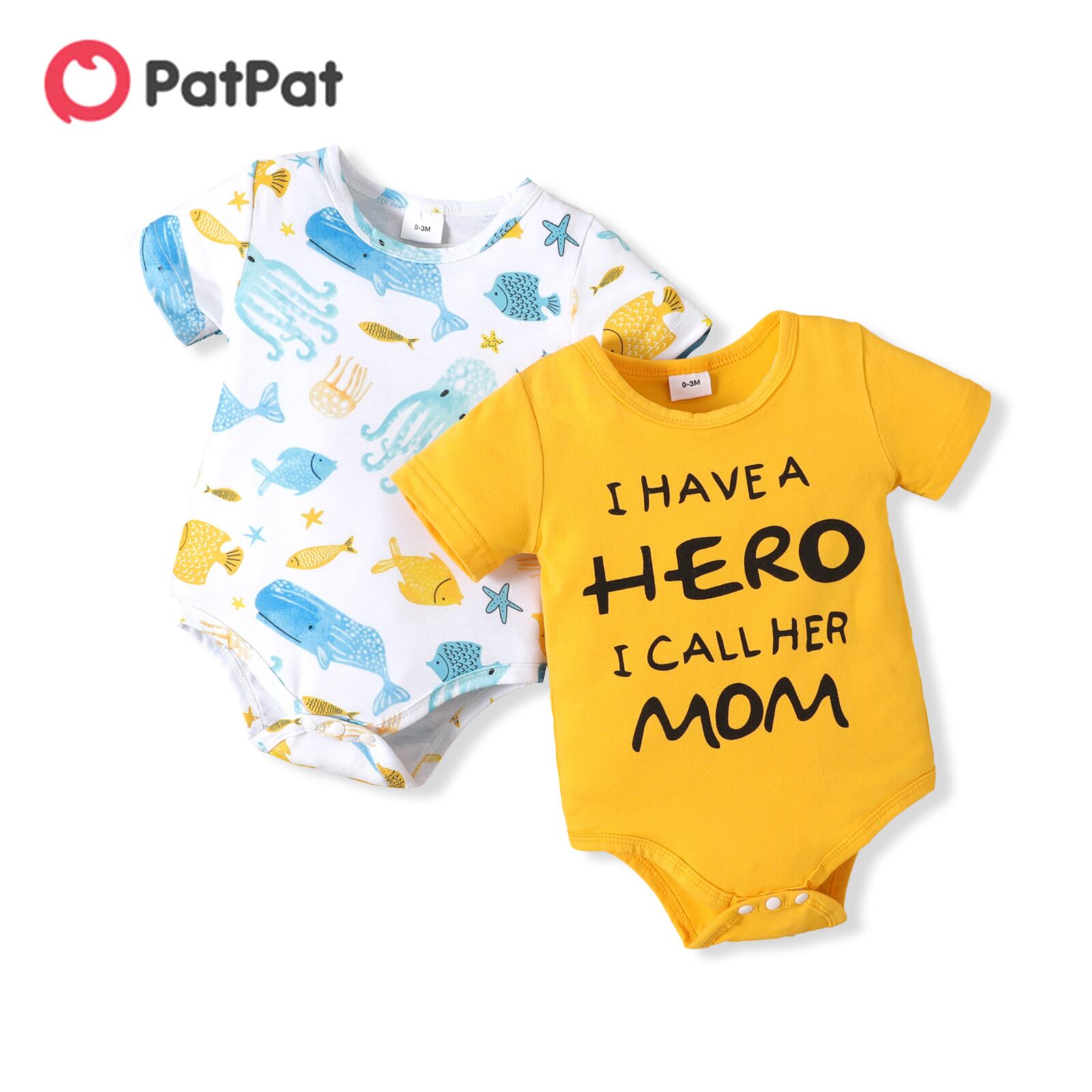 新作 PatPat 2枚組 ベビー 男の子/女の子 綿95% 半袖 総柄 海の動物/レタープリント ロンパースセット