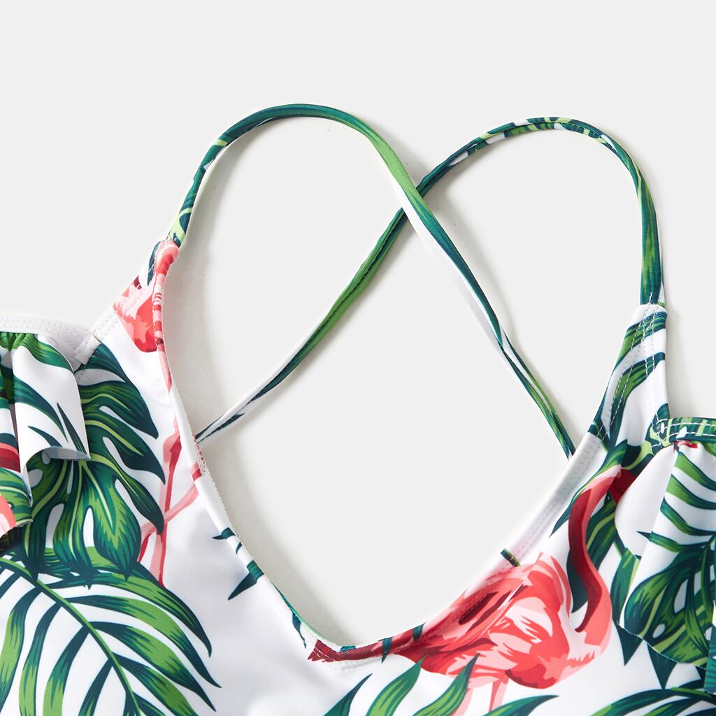 新作 PatPat 2021 夏 ファミリールック フラウンススリーブ フラミンゴとリーフプリント ワンピース お揃い水着
