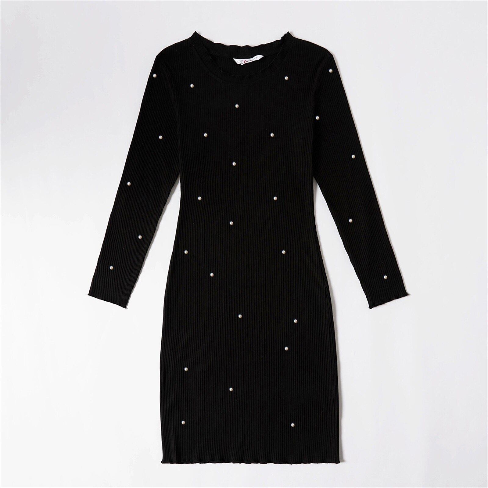 新作 PatPat パール ビーズ ブラック コットン ロングスリーブ ニット リブ ボディコン ドレス ママと私