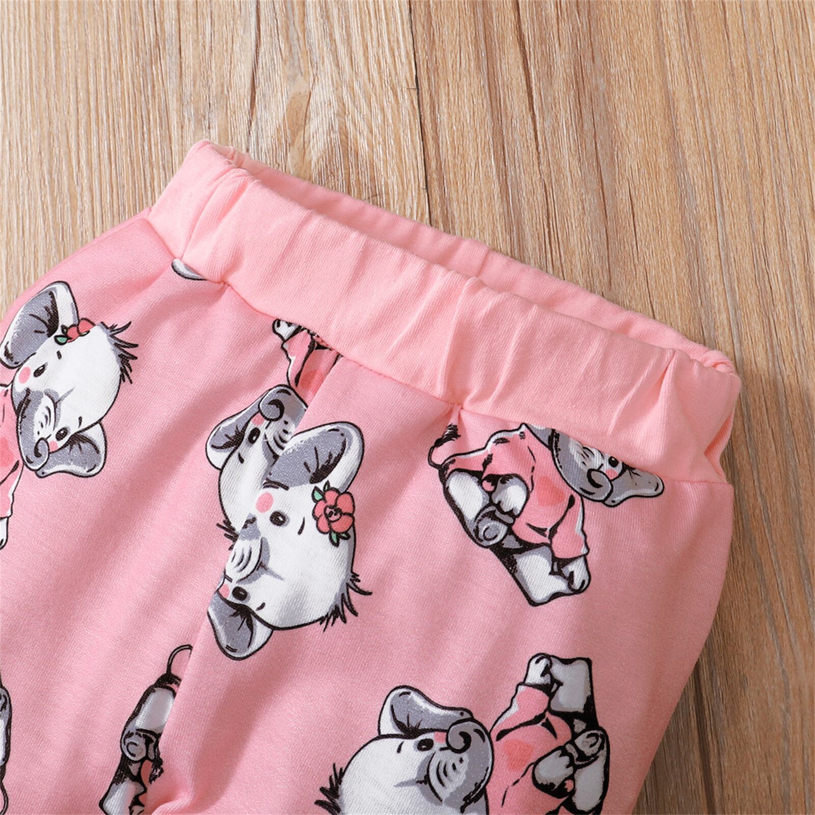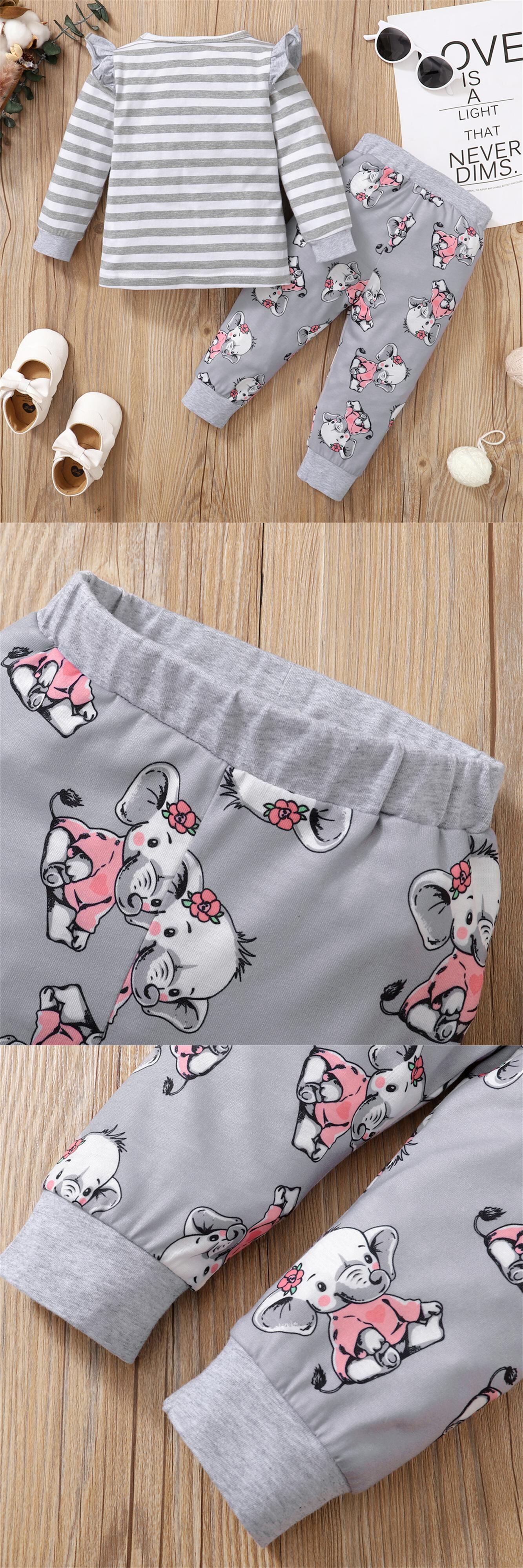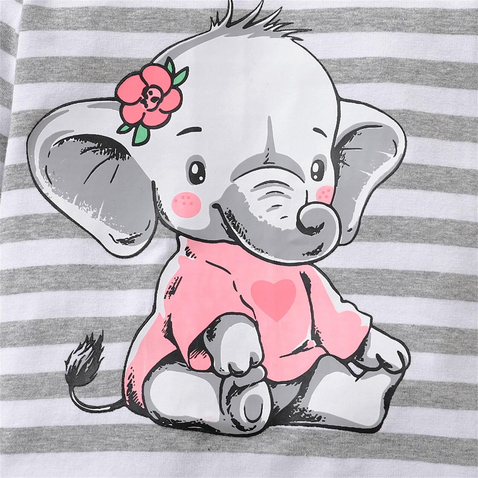 新作 PatPat 2ピース ベビーガール カートゥーン エレファントプリント グレー ストライプ 長袖 トップスとズボンセット