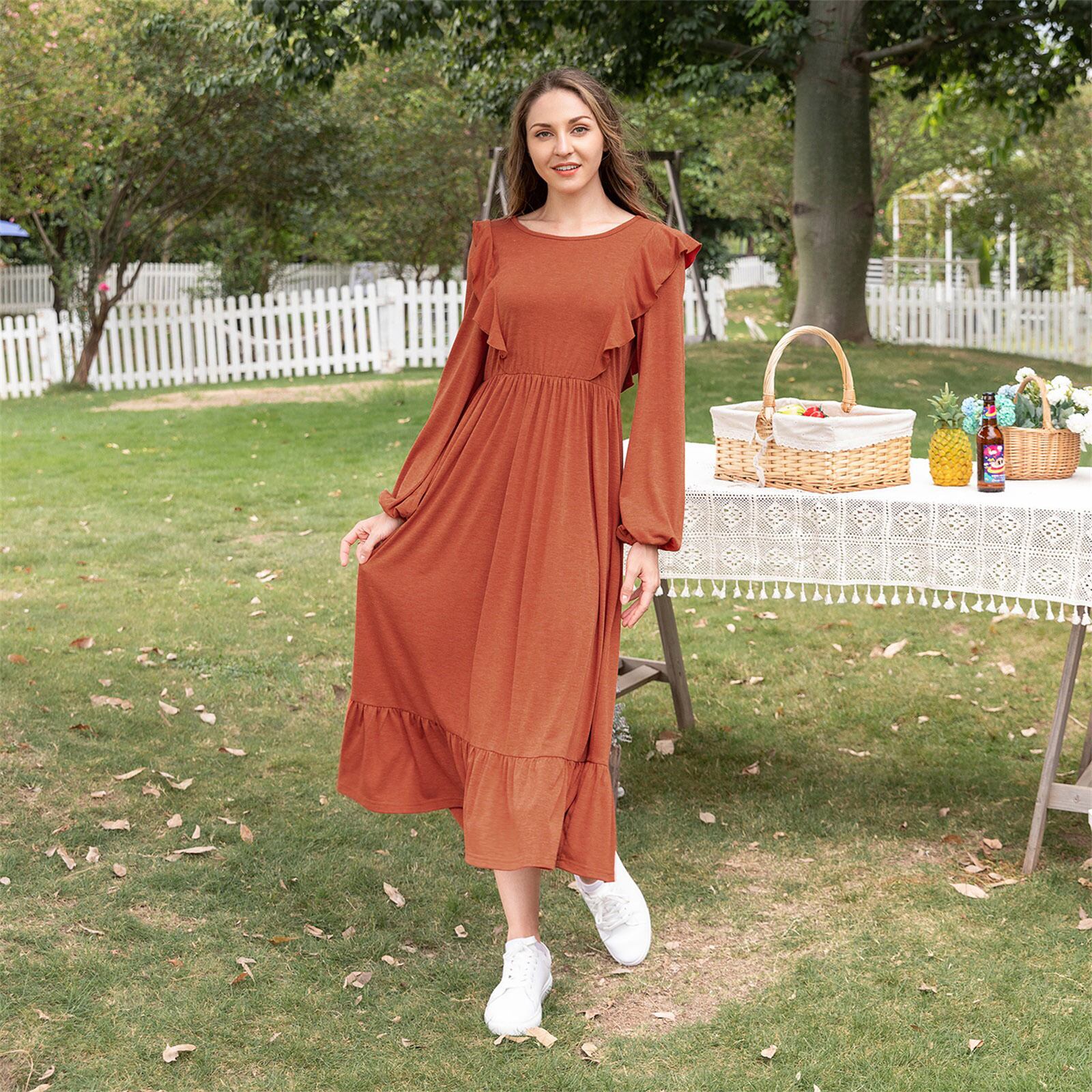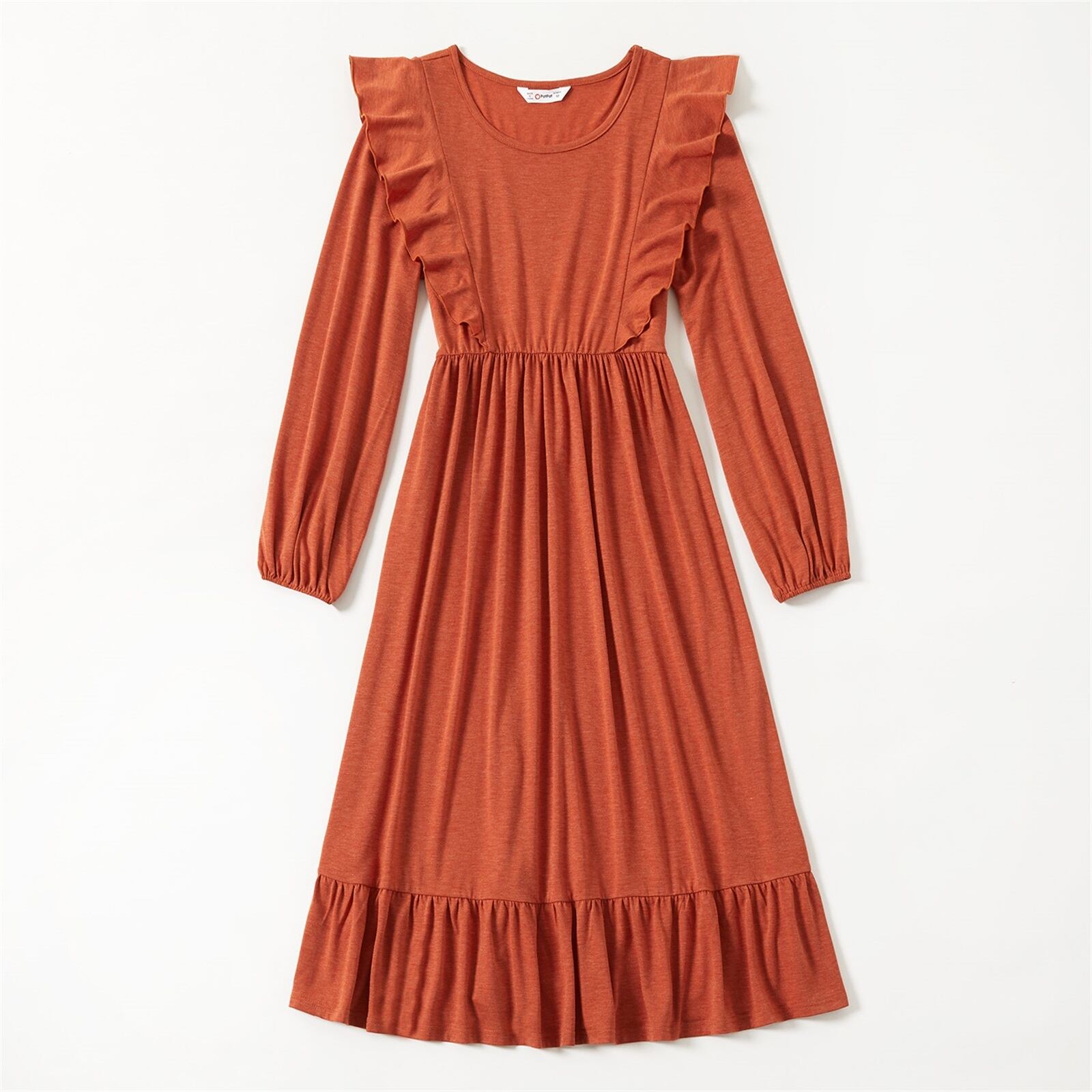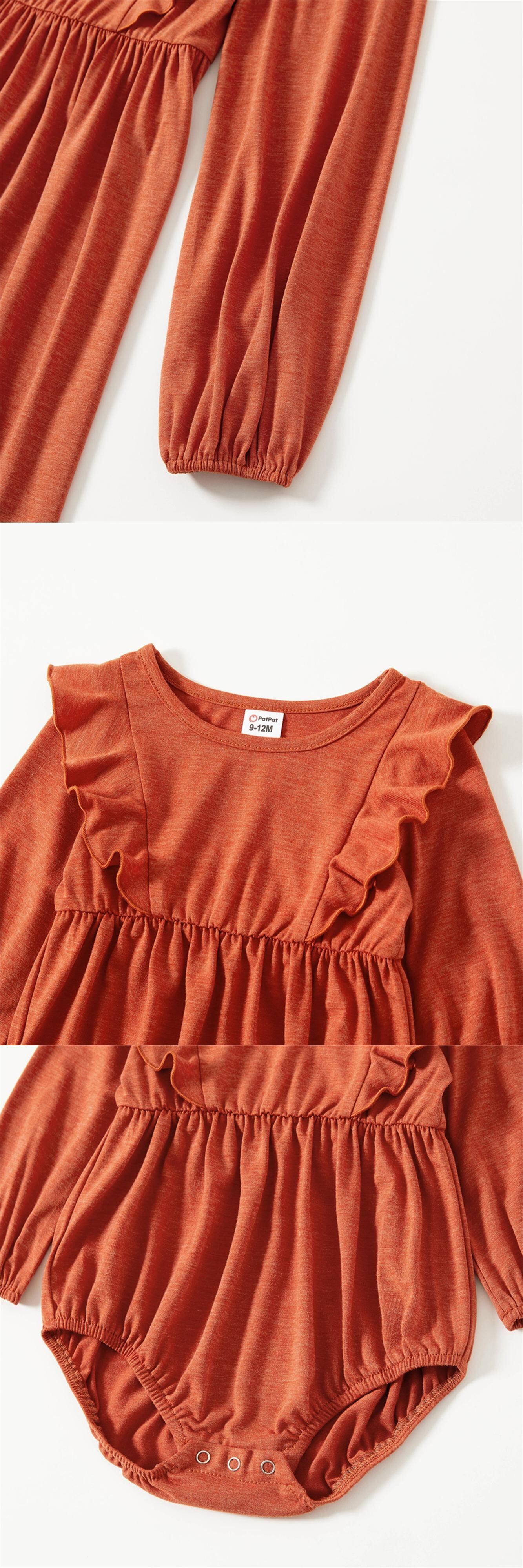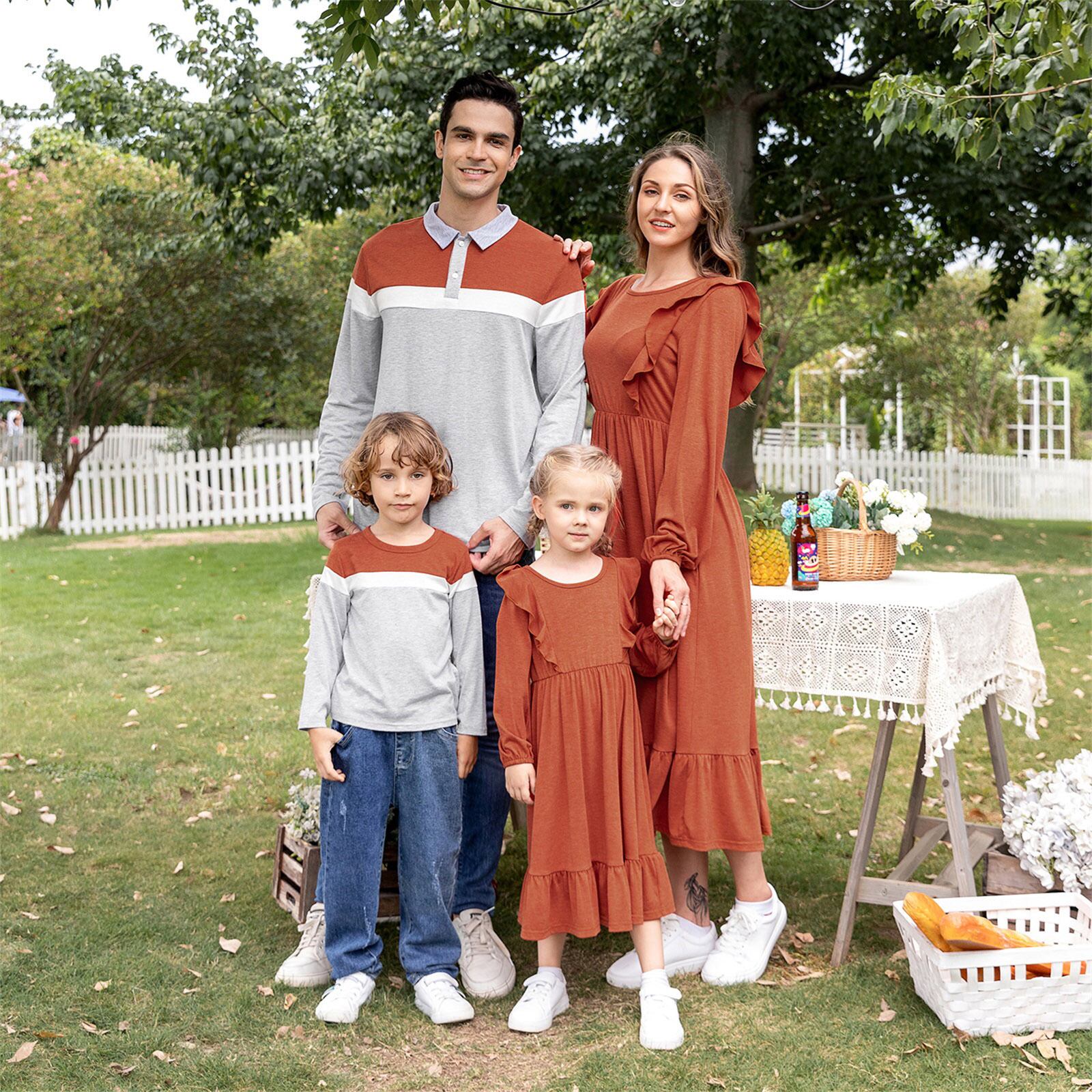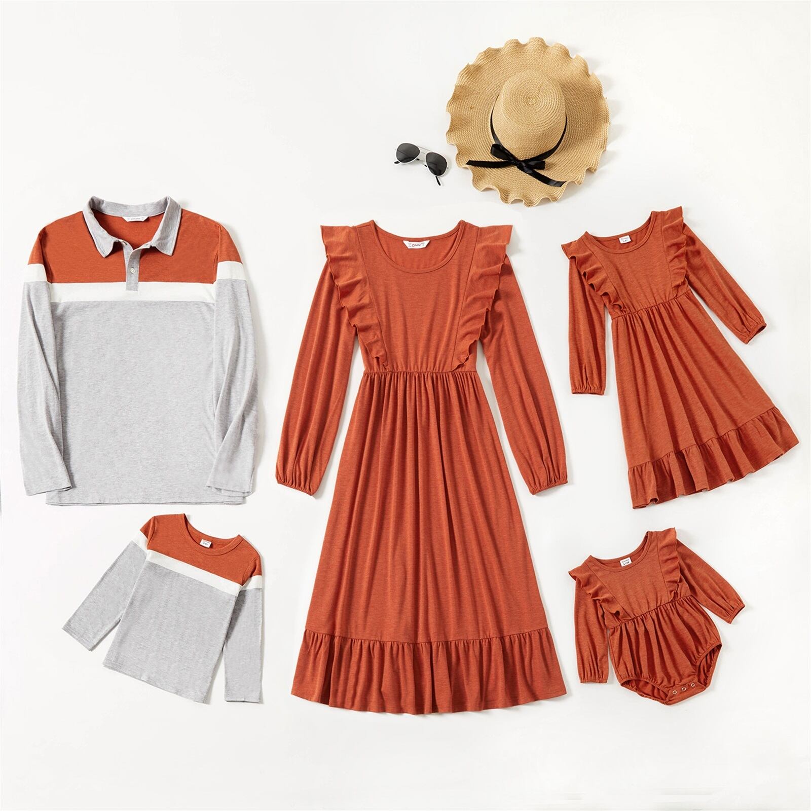 新作 PatPat ファミリーマッチング 無地 長袖 フリル ミディドレスとカラーブロック Tシャツ セット