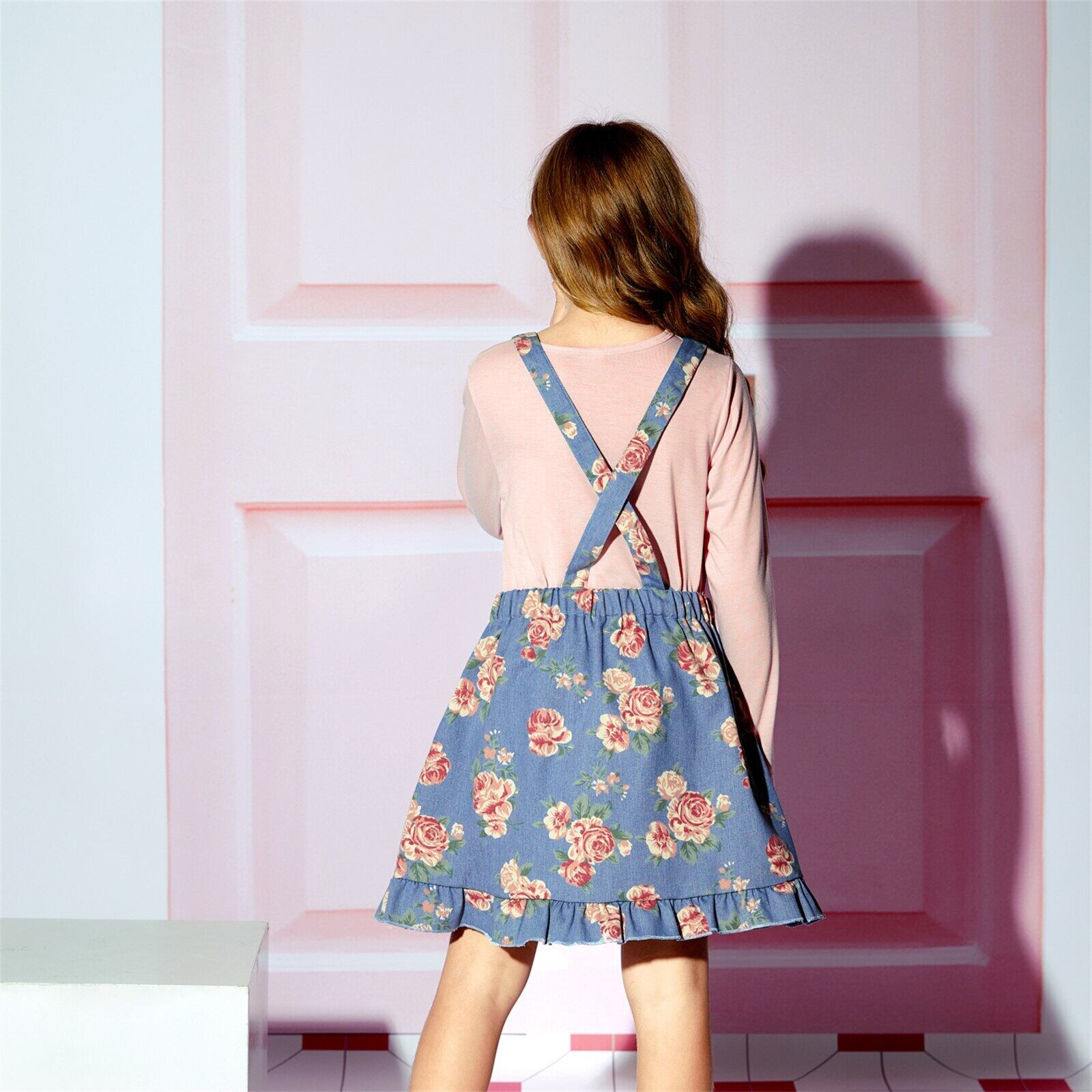 新作 PatPat 2 ピース キッド ガール ロングスリーブ ピンク T シャツとフローラル プリント フリル裾デニム サスペンダー スカート セット