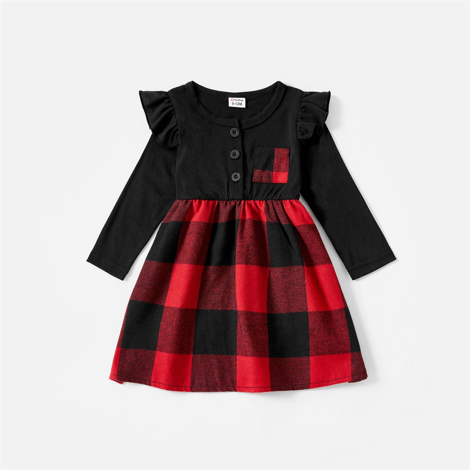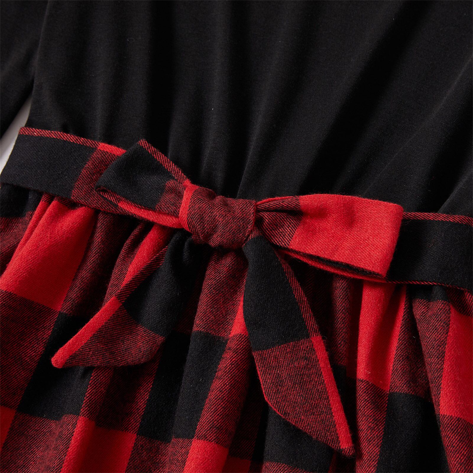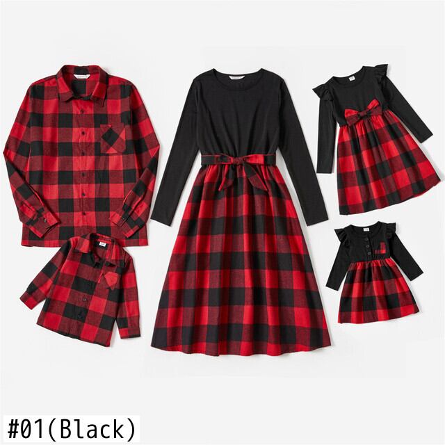 新作 PatPat クリスマス レッド チェック柄 スプライシング ブラック ロングスリーブ ドレスとシャツ セット
