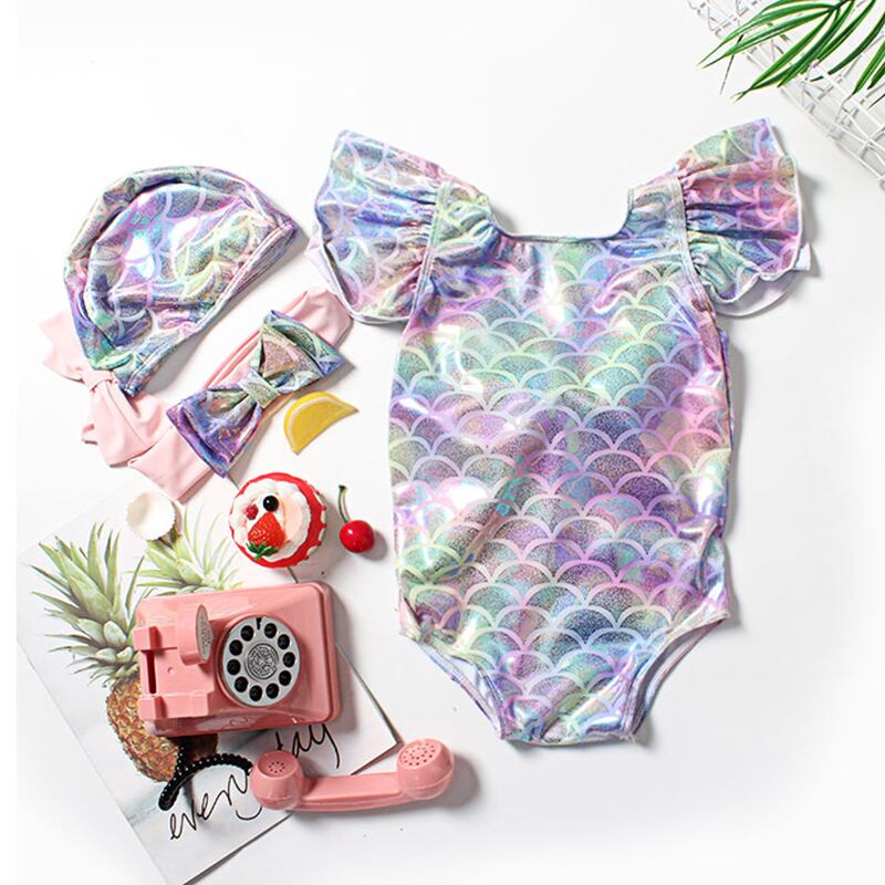 新作 PatPat 3ピース ベビー/幼児 女の子 カラフル スケール プリント ちょう結び 水着とカチューシャ 帽子セット付き