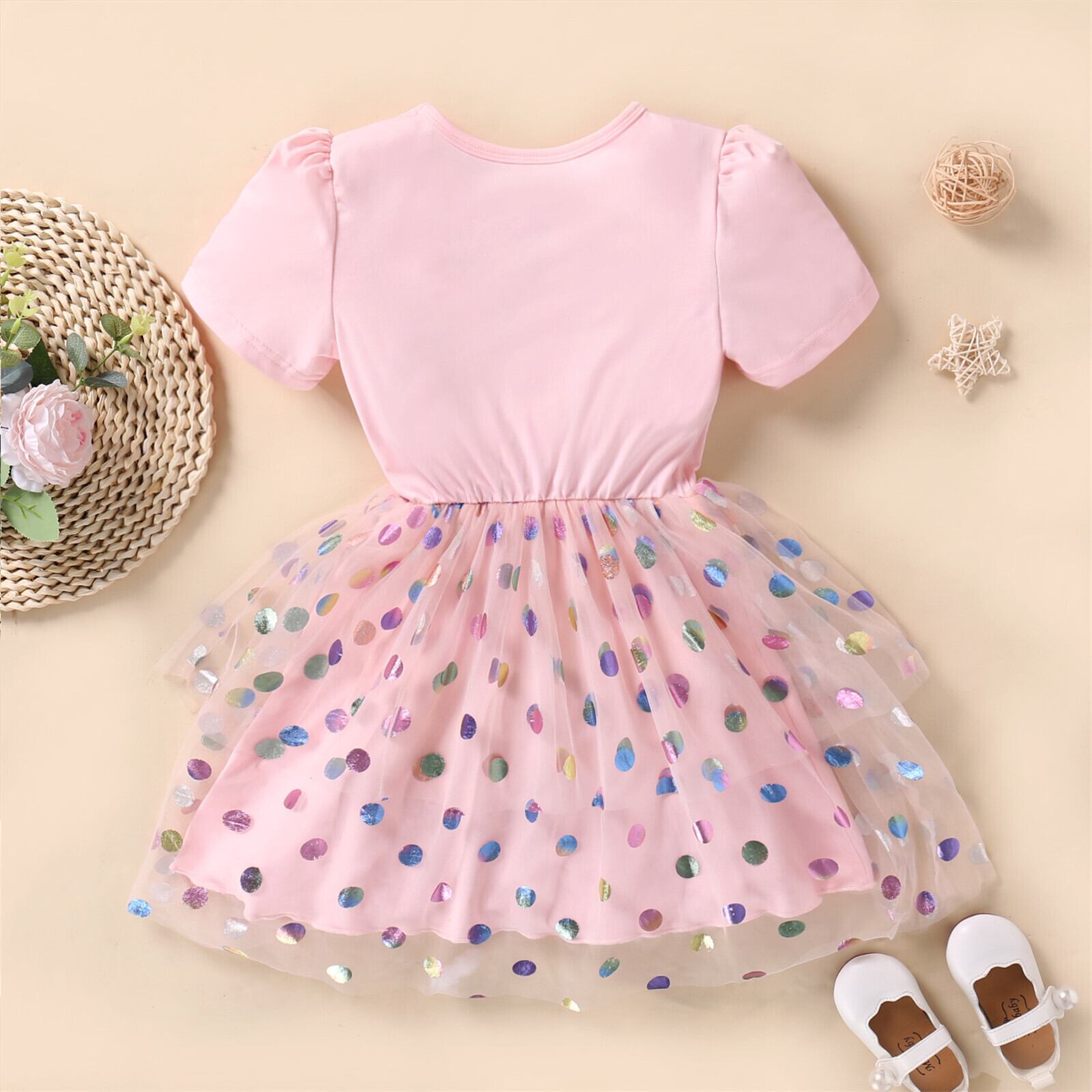 新作 PatPat Kid Girl ユニコーンプリントポルカドットグリッターメッシュショートパフスリーブパーティードレス