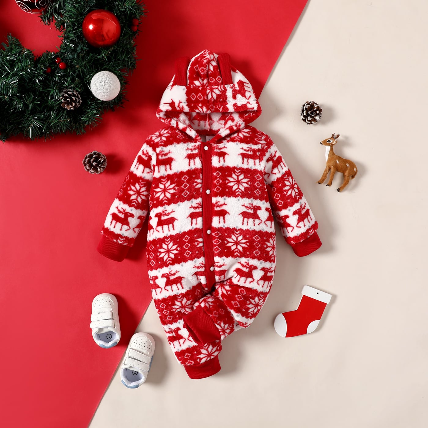 新作 PatPat 男の子 クリスマス鹿 スノーフレーク パターン カラーブロック ファジー フード付き ジャンプスーツ