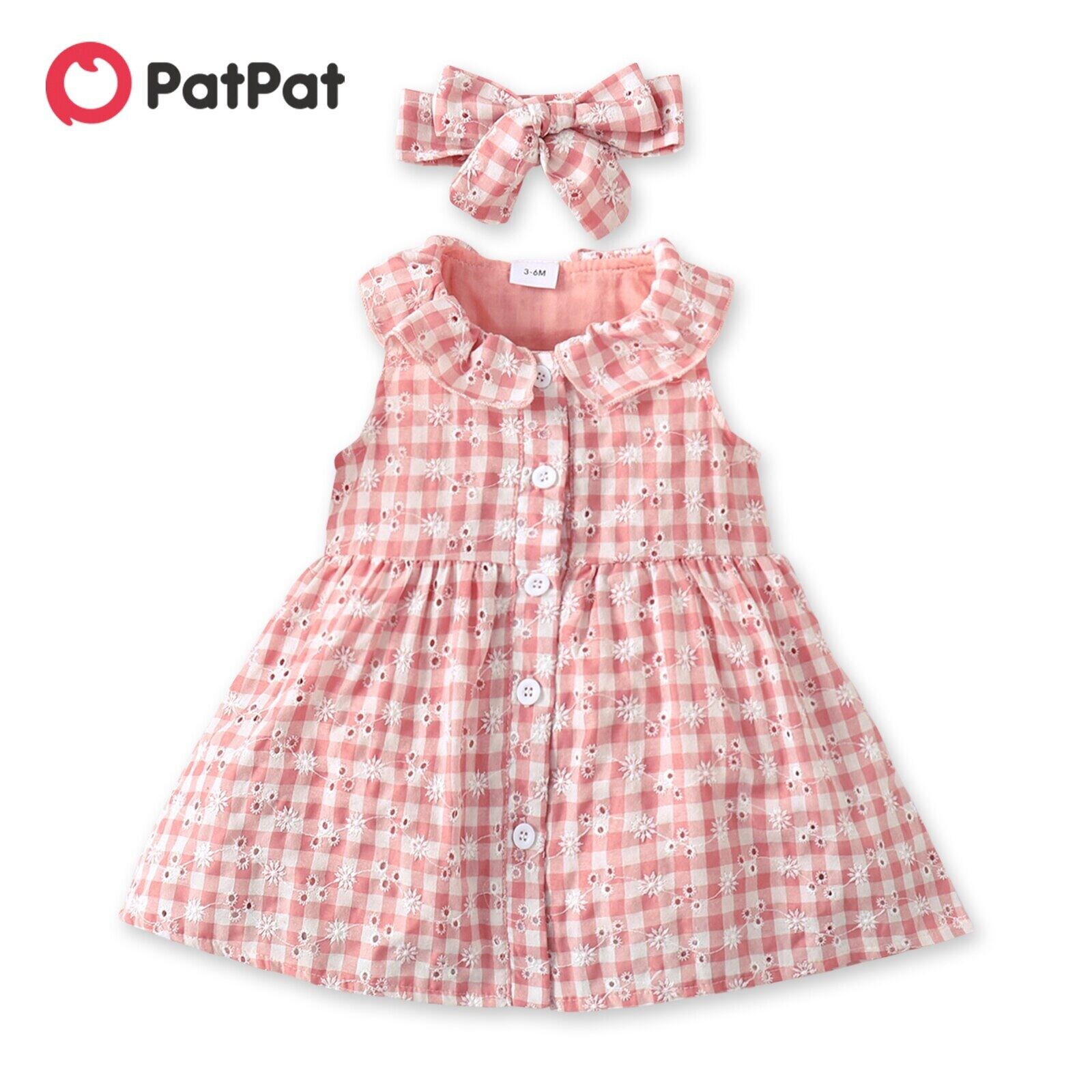 新作 PatPat 2ピース ベビーガール フローラル 刺繍 ピンク チェック柄 フリル ノースリーブ タンクドレス ヘッドバンドセット付き