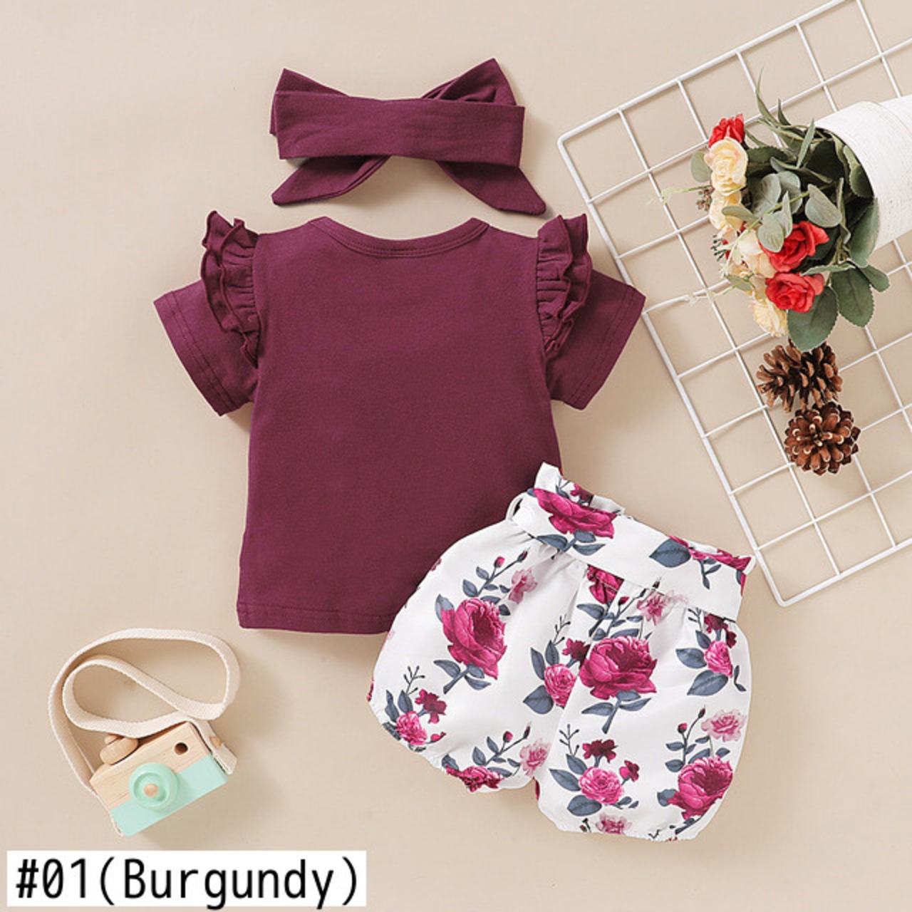 新作 PatPat無地半袖トップとカチューシャ付き総柄ショーツセット