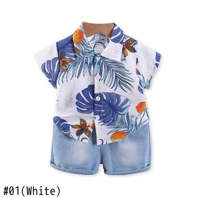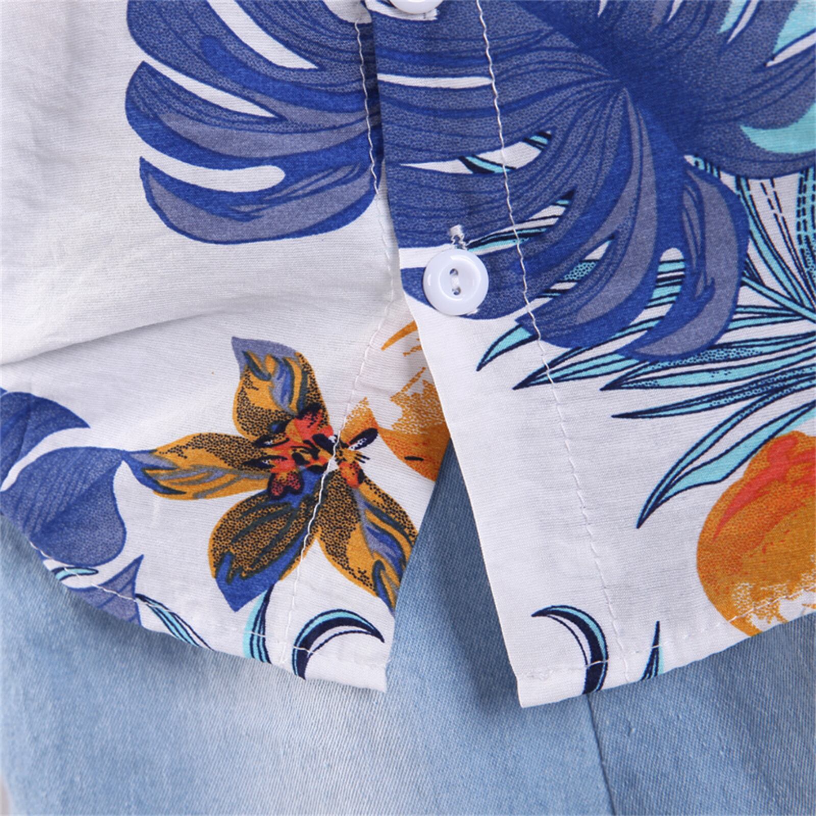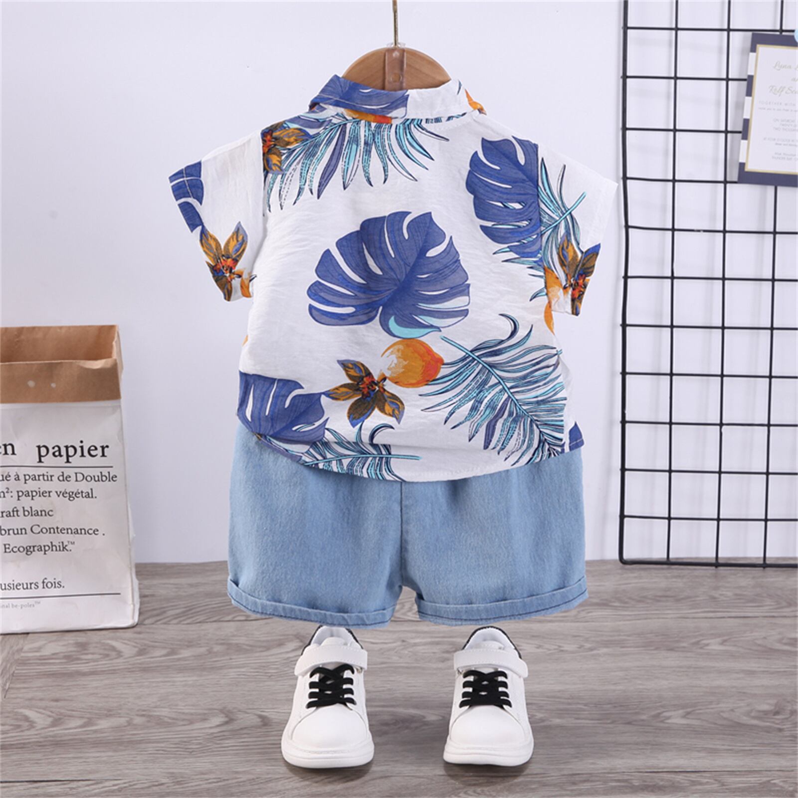 新作 PatPat 2pcs ベビーボーイ 綿95% 半袖 熱帯植物プリントシャツとデニムショーツセット