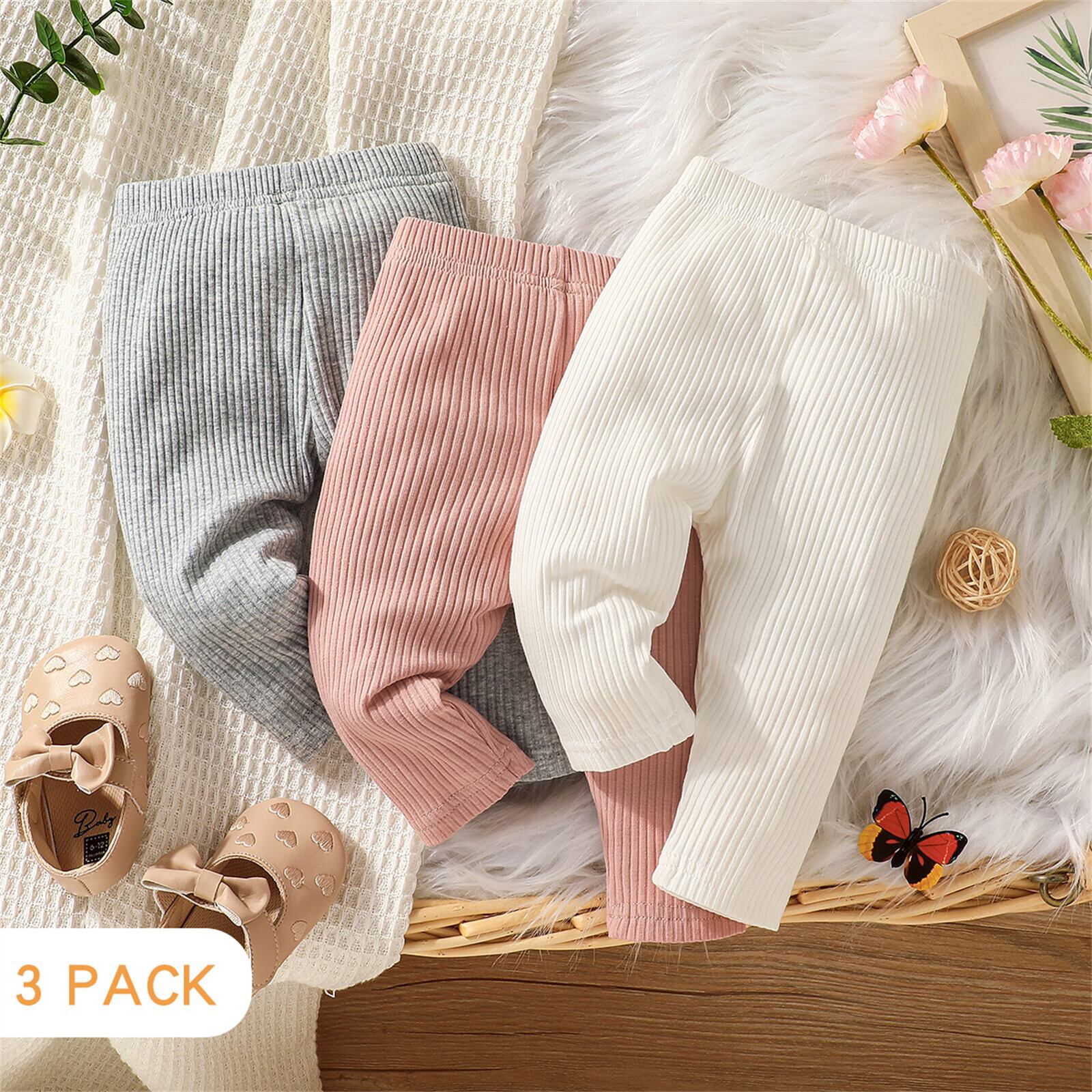 新作 PatPat 3 パック ベビー ガール コットン 95% リブ ニット レギンス セット