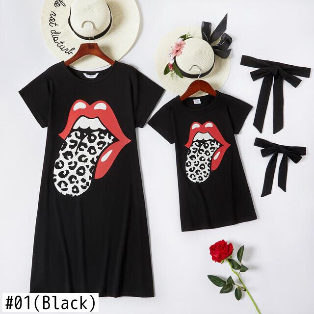 新作 PatPat レオパードとレッド リップ プリント ショートスリーブ マッチング ブラック ミディ ドレス