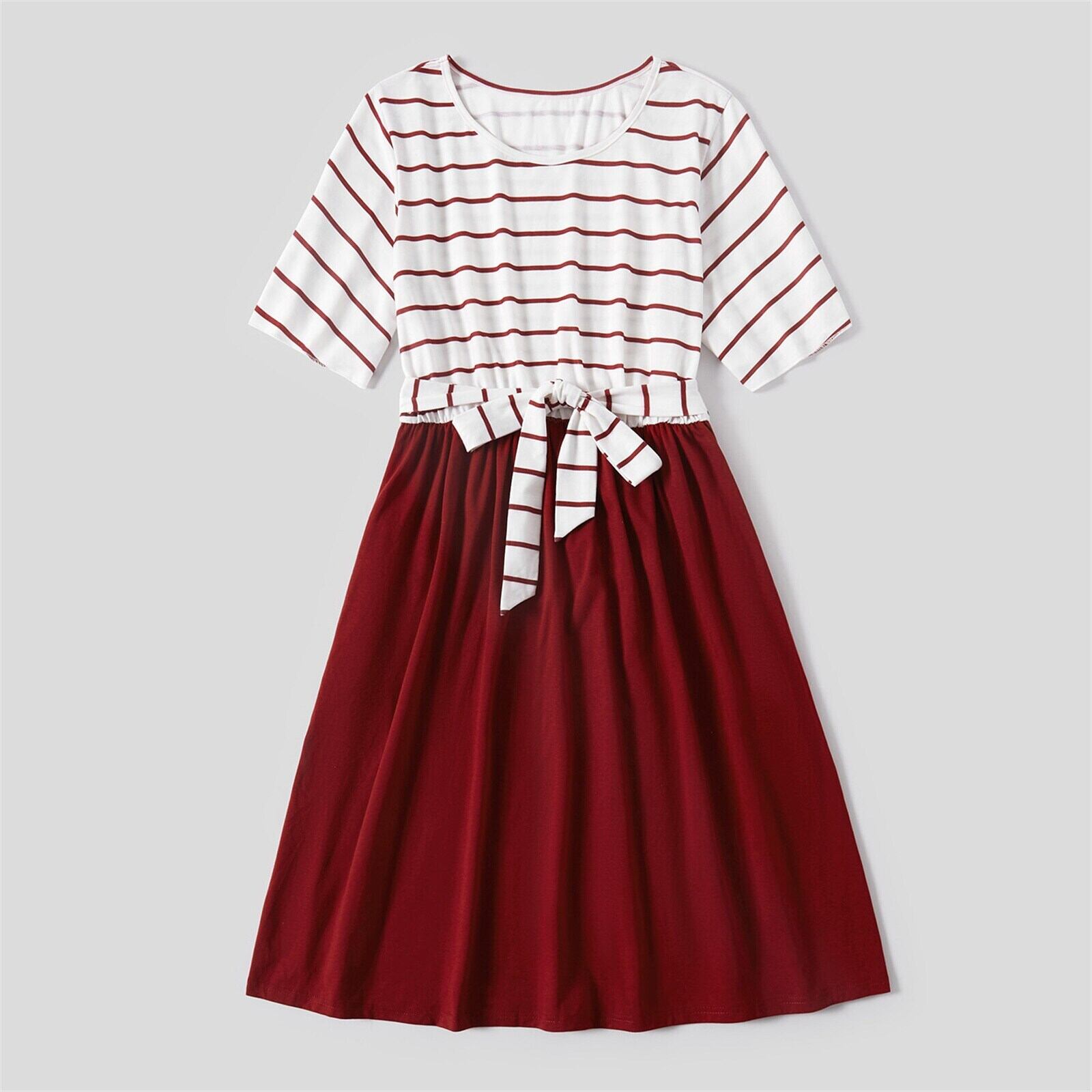 新作 PatPat 紅白ストライプ半袖ファミリーお揃いセット(ベルト付きスプライシングドレスとTシャツ)