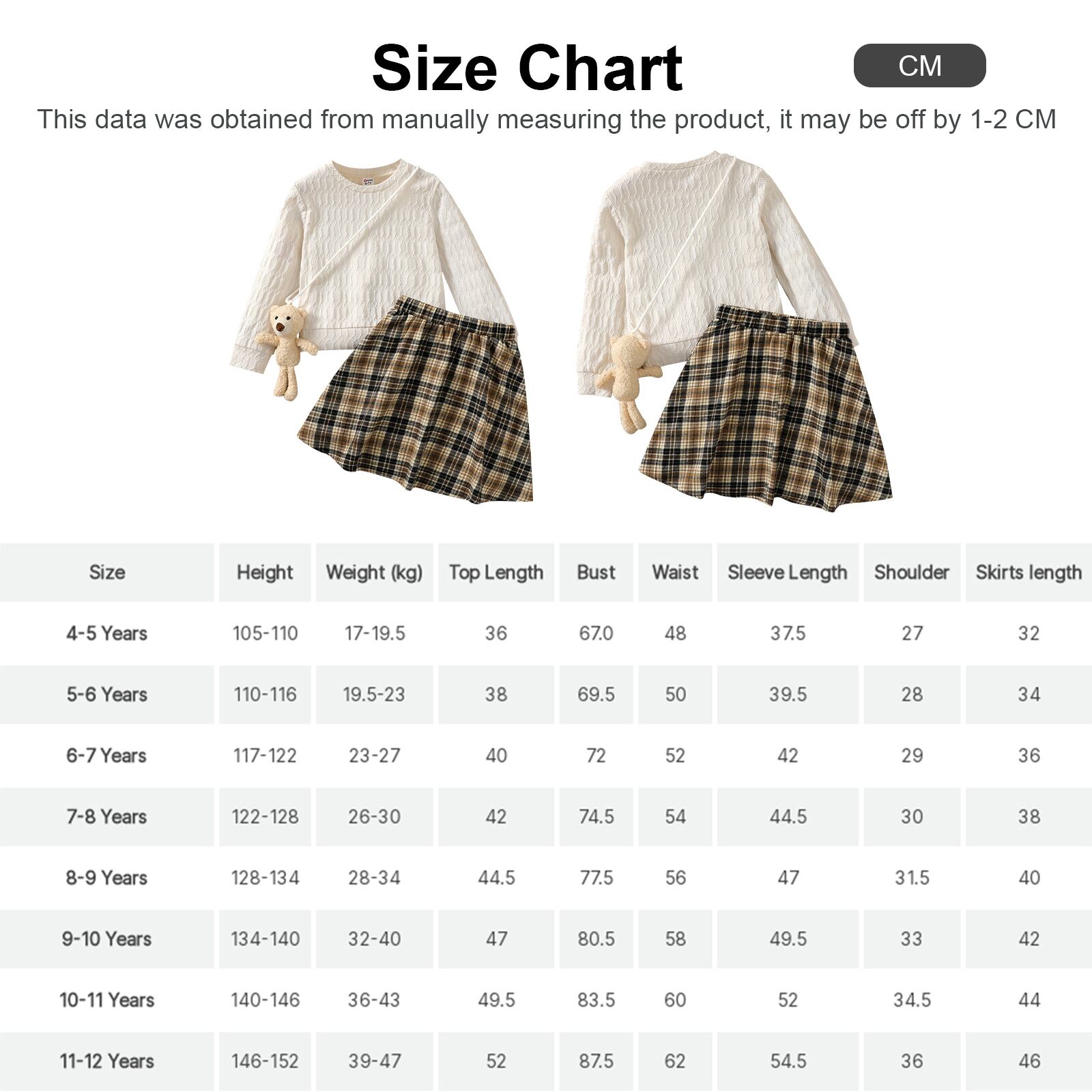 新作 PatPat 2ピース キッド ガール テクスチャード ホワイト プルオーバーとチェック柄スカートセット (クマの人形が含まれています)。