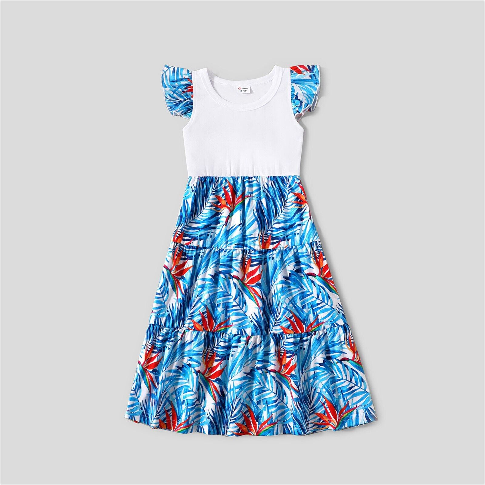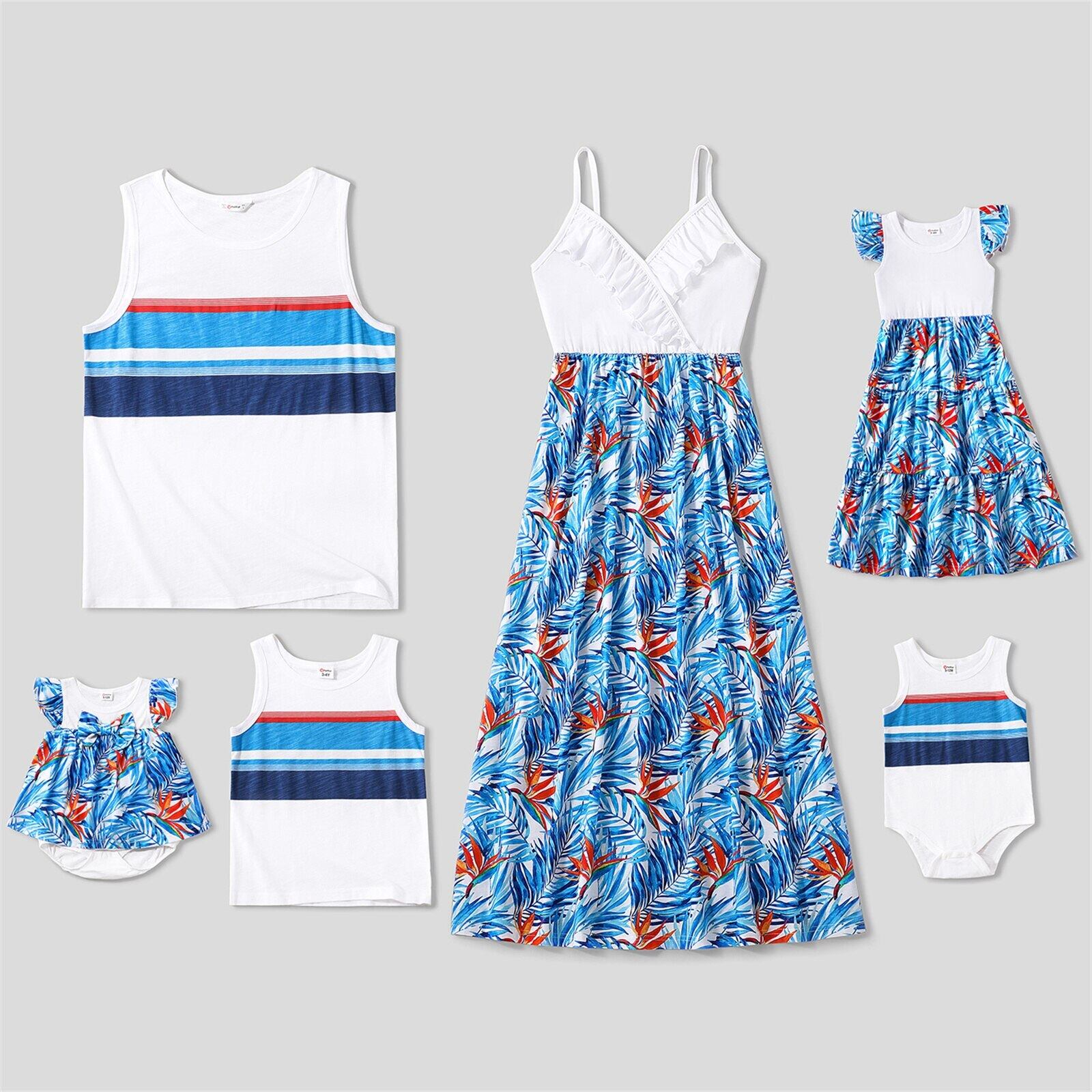 新作 PatPat ファミリー マッチング ソリッド V ネック スパゲッティ ストラップ スプライシング プラント プリント ドレスと 100% コットン ノースリーブ タンクトップ セット