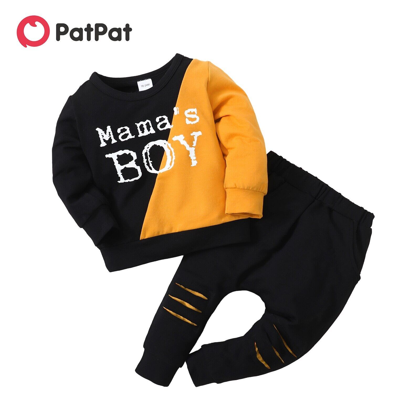新作 PatPat 2ピース ベビーボーイ レタープリント カラーブロック 長袖スウェットシャツと破れたズボンセット
