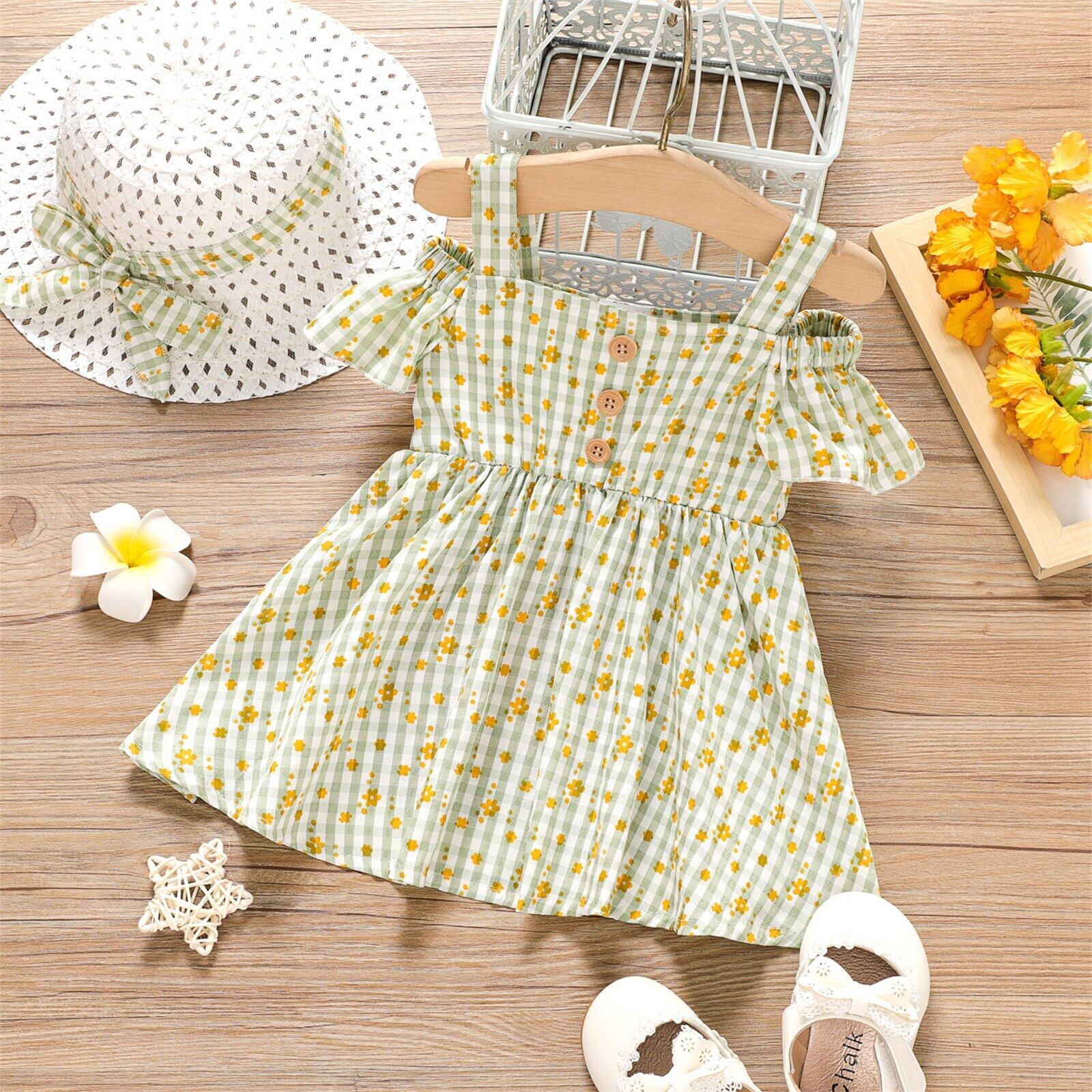 新作 PatPat 2ピース 女の赤ちゃん 全体に花柄プリント チェック柄 コールドショルダー 半袖ドレス 帽子セット付き