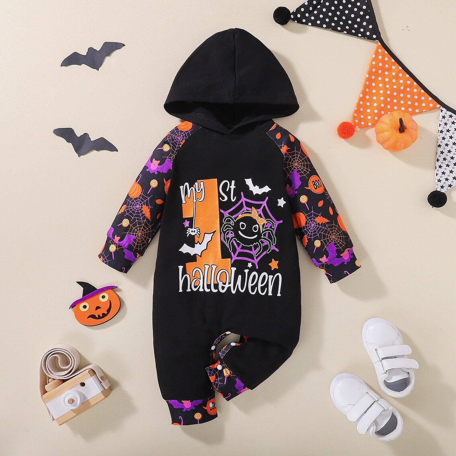 新作 PatPat キッズ ベビー 男の子/女の子 全体ラグランスリーブ クモの巣 & レタープリント フード付き ジャンプスーツ ベビー服セット
