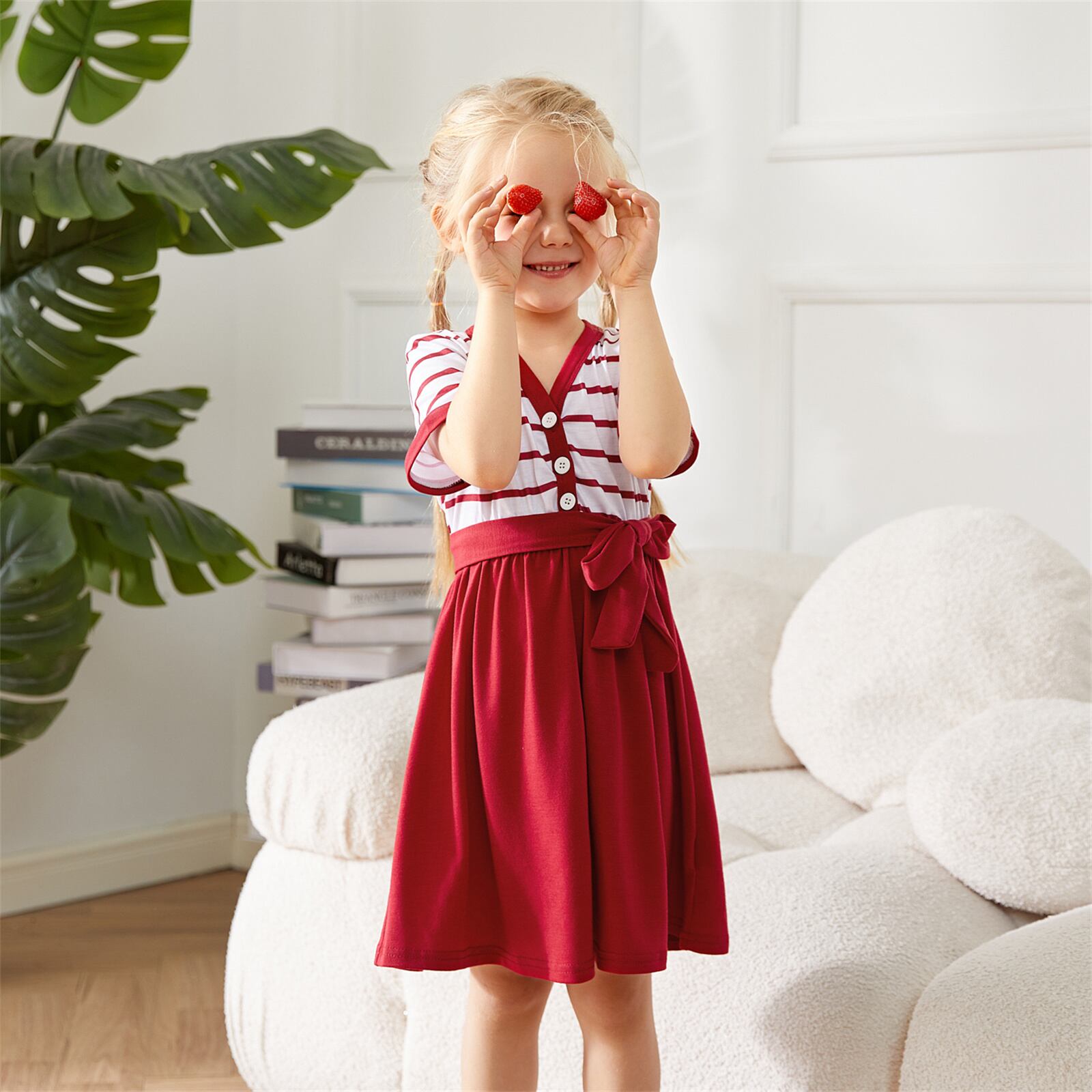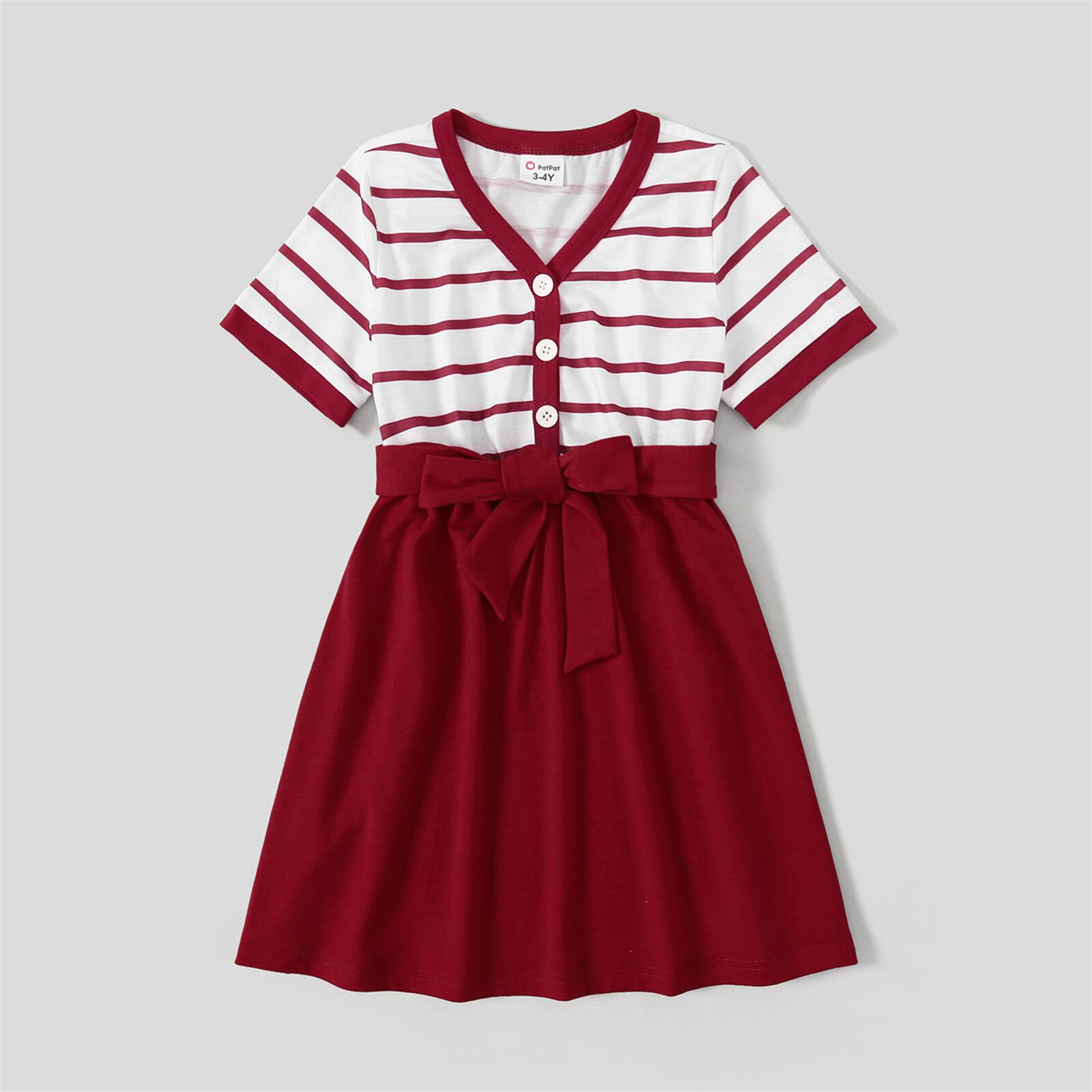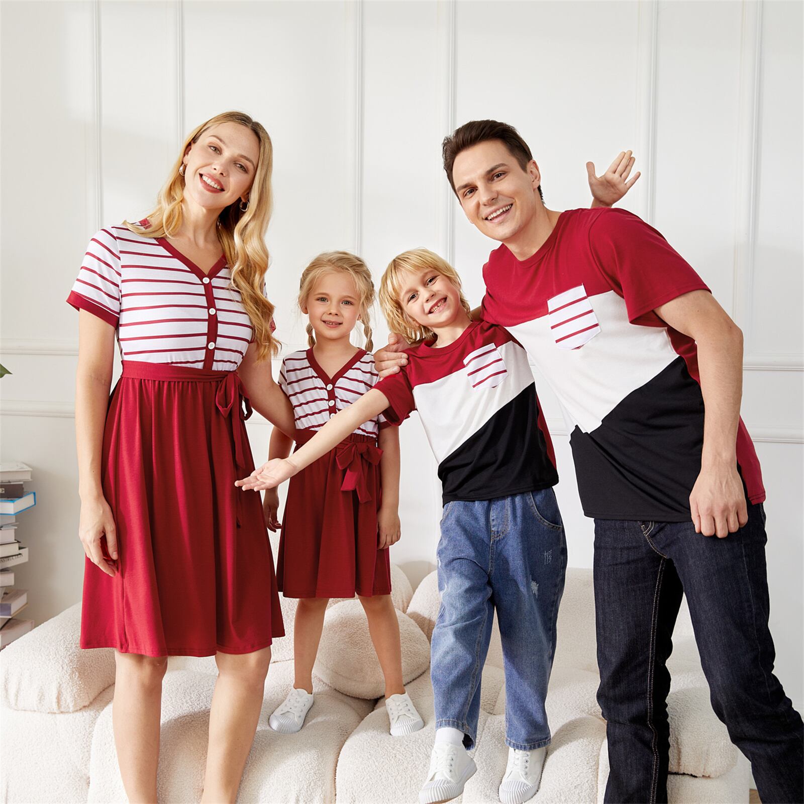 新作 PatPatファミリーマッチングストライプVネックボタンアップ半袖スプライシングドレスとカラーブロックTシャツセット