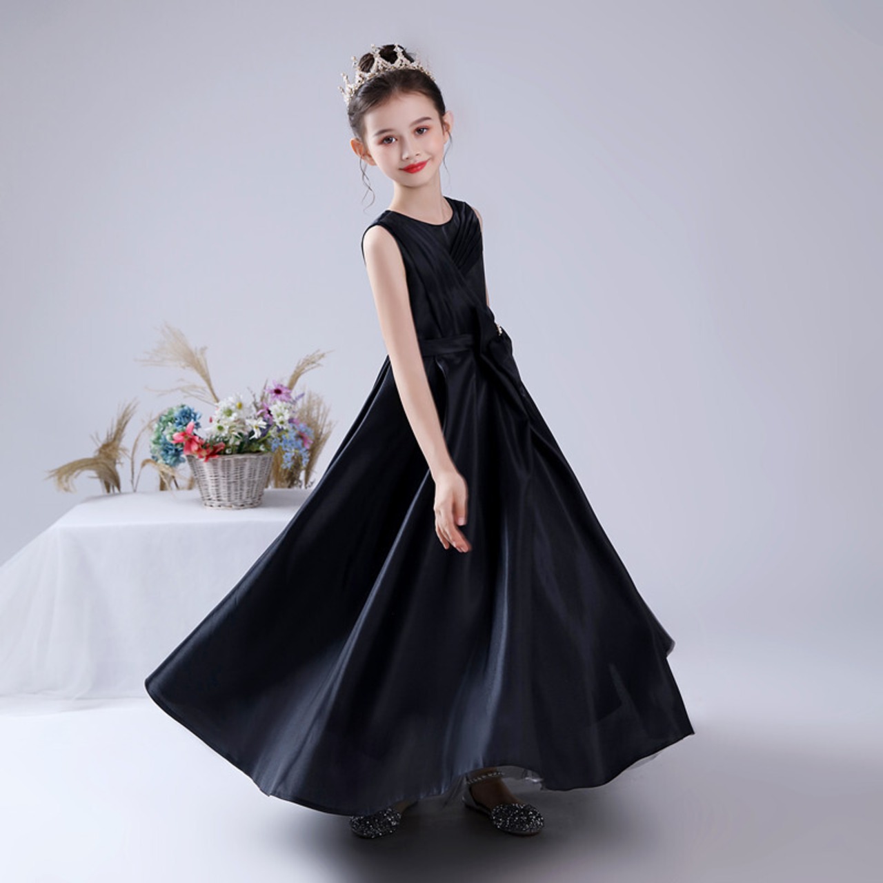 Dideyttawl 黒コンサートドレスプリーツジュニアガールズページェントガウンロングフラワーガールドレス誕生日 2022