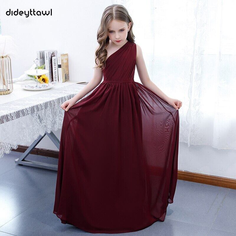 Dideyttawl ブルゴーニュロングシフォンフラワーガールドレス子供の誕生日クリスマスガウンワンショルダープリーツジュニアウエディングドレス