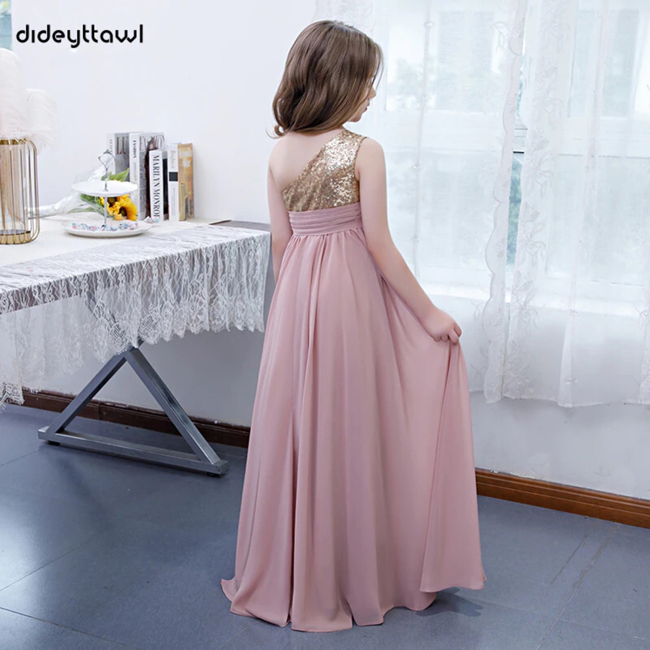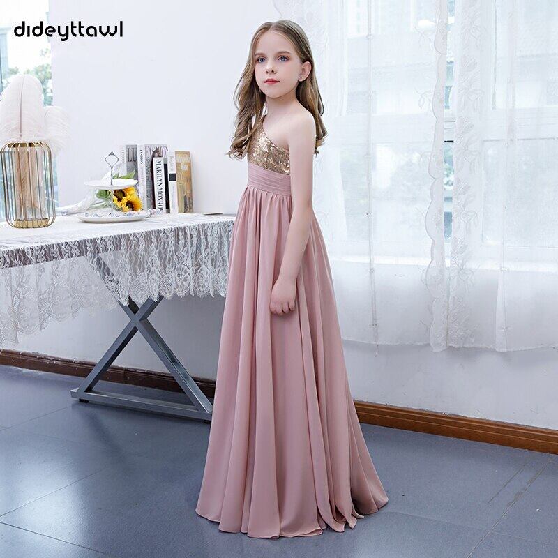 Dideyttawl ダスティピンクワンショルダーシフォンフラワーガールズドレス 2022 スパンコール A ライン子供の誕生日パーティージュニアウエディングドレス