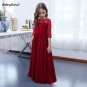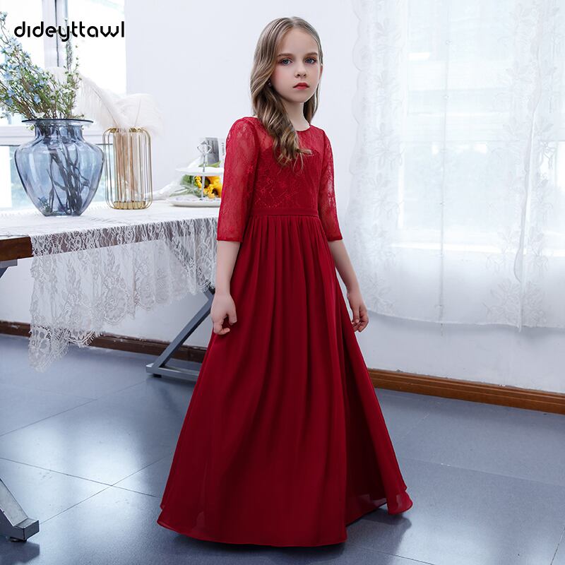 Dideyttawl ブルゴーニュシフォン半袖レースロングフラワーガールドレス 2022 A ライン子供の誕生日ページェントパーティーガウン