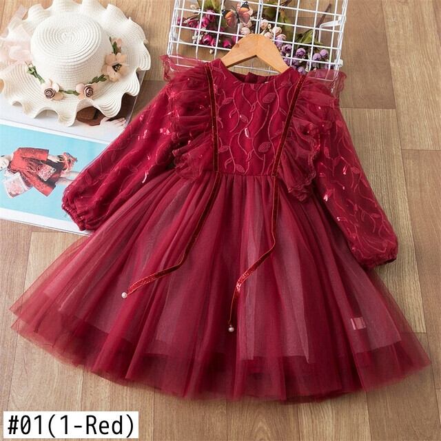 秋長袖ドレス女の子赤ヴィンテージスパンコール花服誕生日パーティー子供クリスマス年チュール Vestido