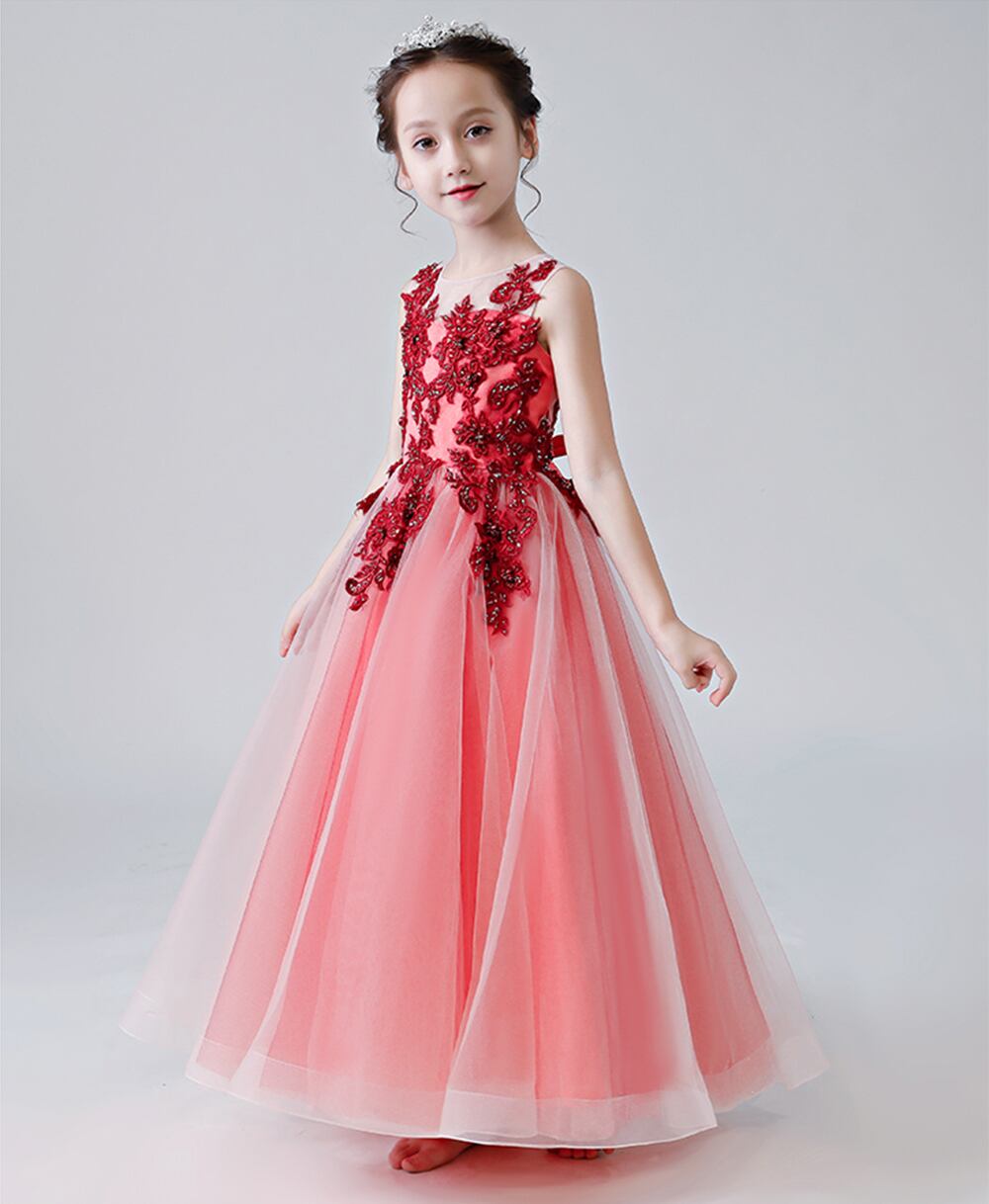 赤いチュール フラワー ガール ドレス レース アップリケ ノースリーブ キッズ誕生日パーティー ページェント ガウン 初聖体ドレス