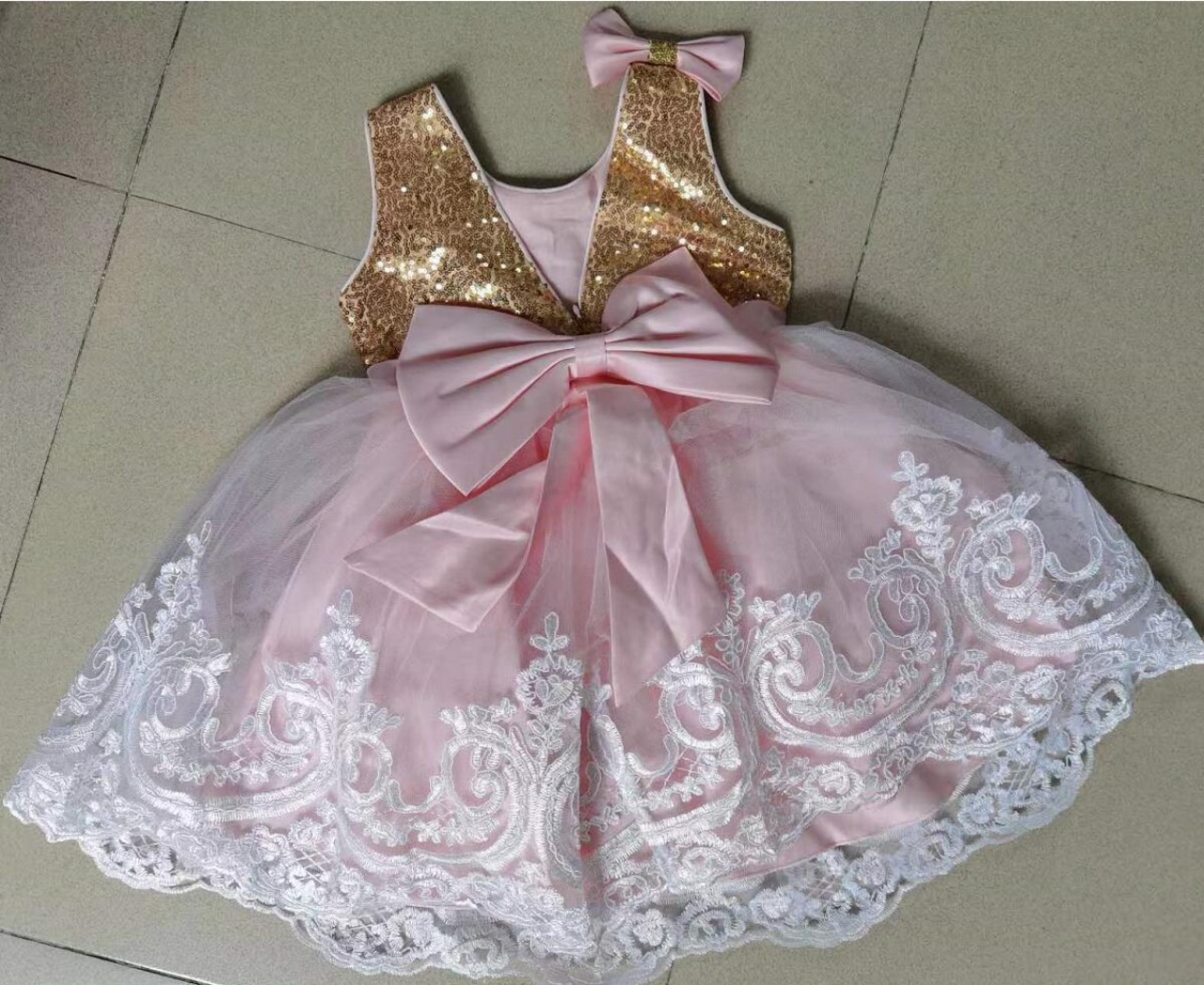 かわいい女の子のパーティードレスウェディングガールスパンコールちょう結び誕生日子供レースフラワーセレモニー