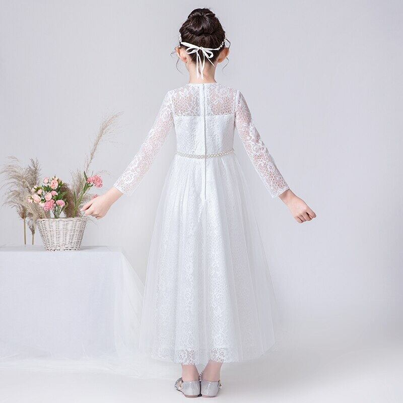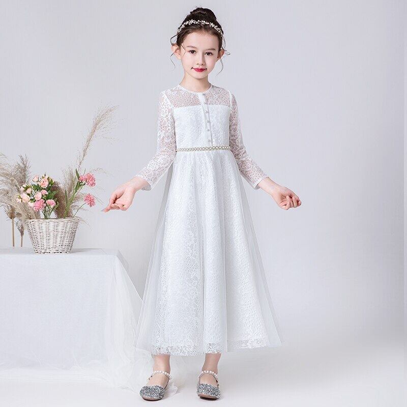ロング ホワイト レース ウェディング フラワー ガール ドレス イブニング パーティー ドレス 3/4 スリーブ ジュニア ウエディング ガール マル ガウン くるぶし丈
