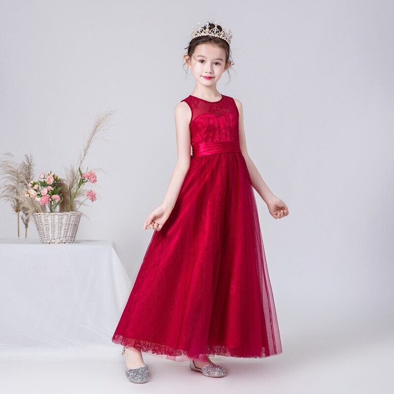 キッズロングマルドレスページェントドレスブルゴーニュレースフラワーガールドレス結婚式誕生日パーティーボウタイ