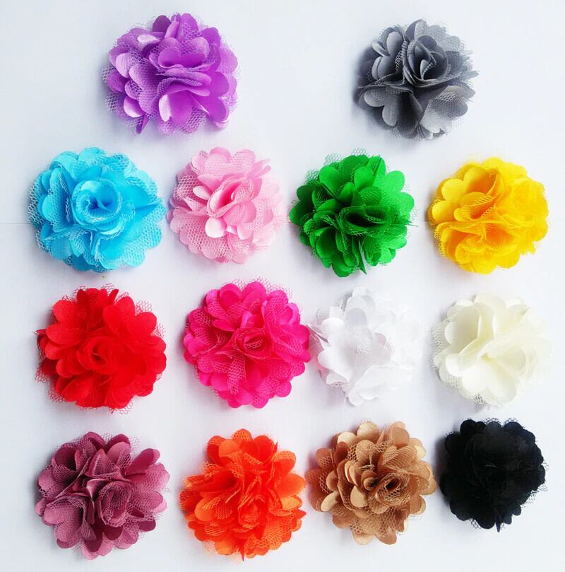 2 "花の女の赤ちゃんヘアアクセサリーサテンメッシュフラワーヘアクリップなしヘアフラワーヘッドバンド 14 色 50 個あたりロット