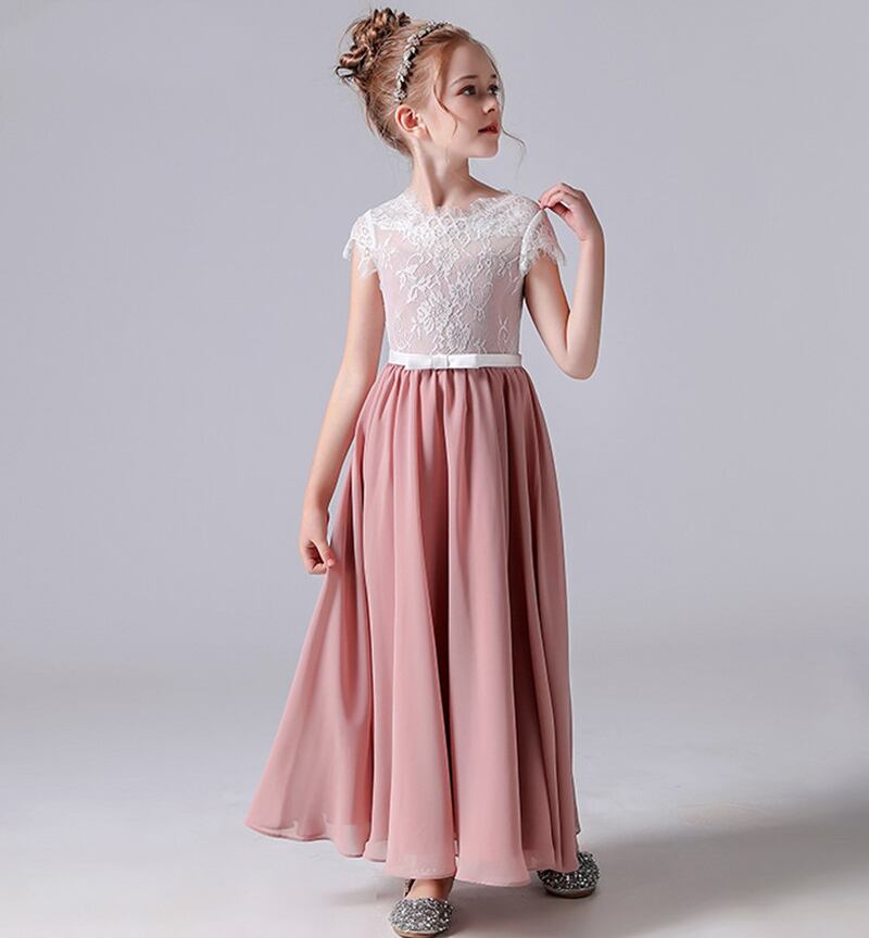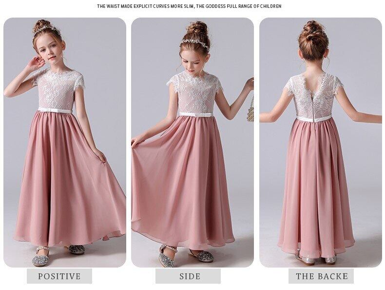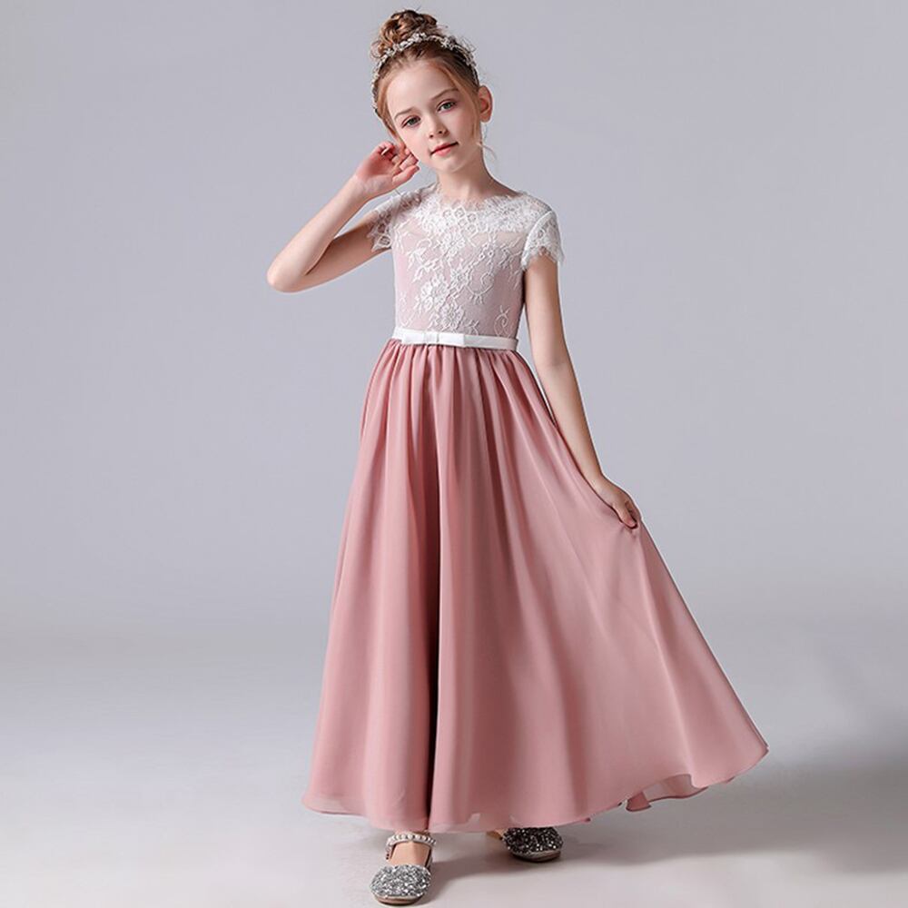 Dideyttawl ピンクロングレースジュニアウエディングドレス半袖フラワーガールドレスシフォン女の子マル誕生日パーティーガウン