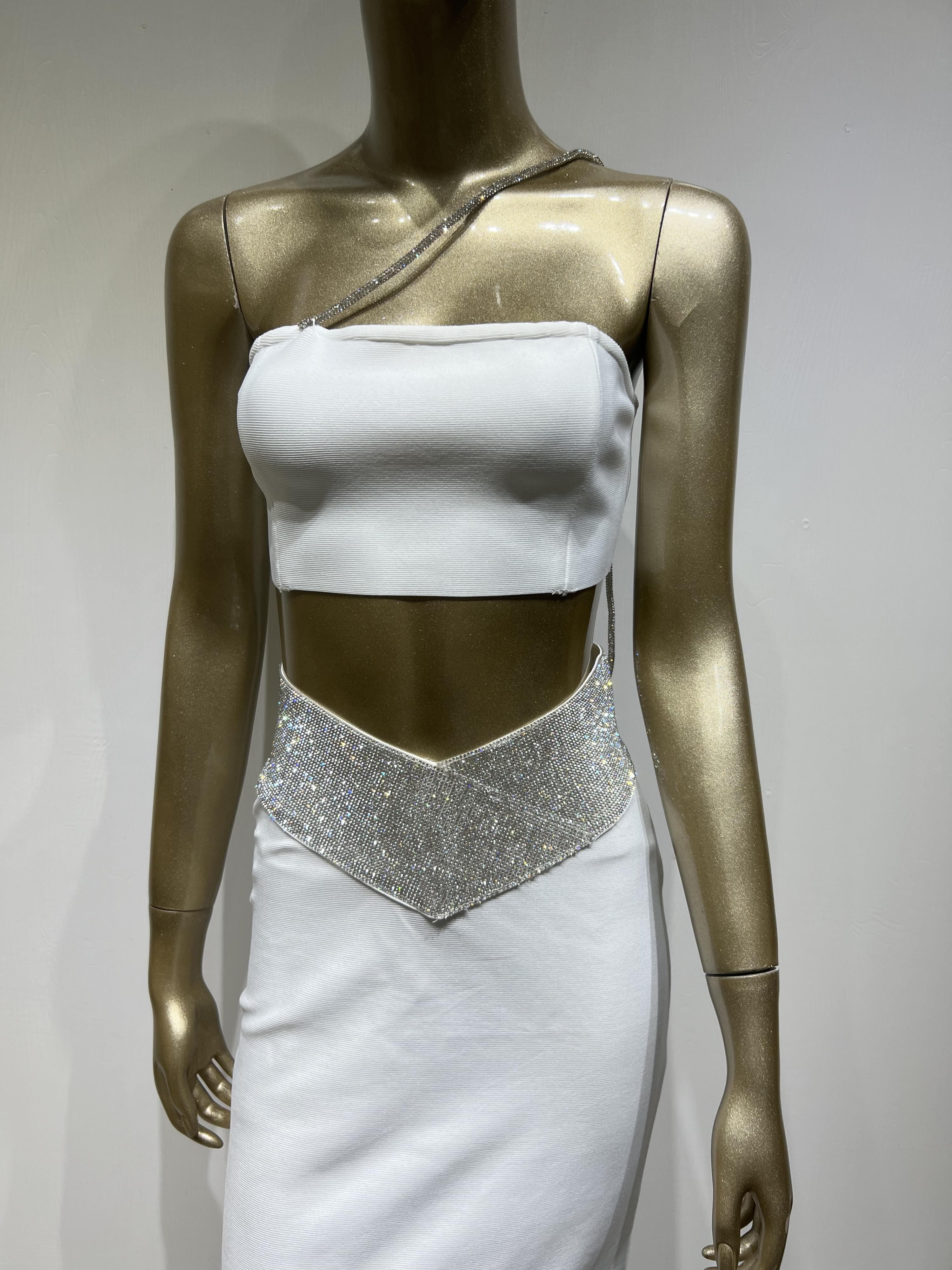 女性の夏のセクシーなワンショルダークリスタルダイヤモンド白黒ツーピースロング包帯セット 2022 有名人のイブニングパーティーの女性のセット