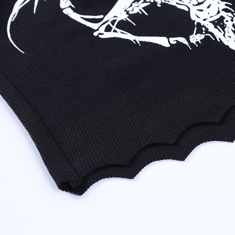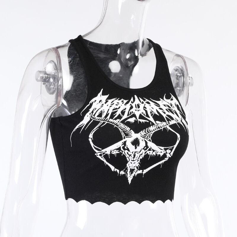ゴシックニットパンク黒タンクトップモールゴスグランジヤギプリント原宿女性クロップトップススキニーノースリーブストリート