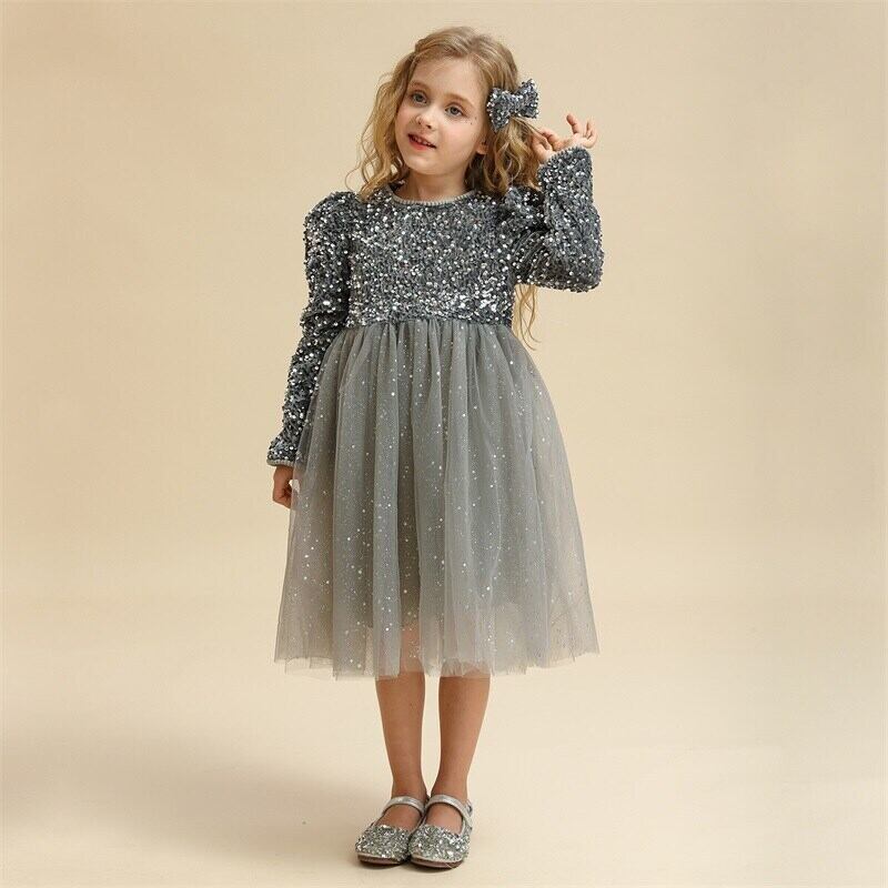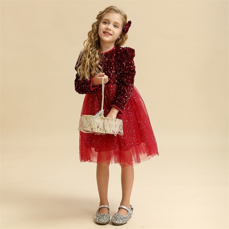 スパンコール子供パーティードレス女の子春秋長袖女の子ドレス誕生日結婚式イブニングチュールガウン 3-8 Y