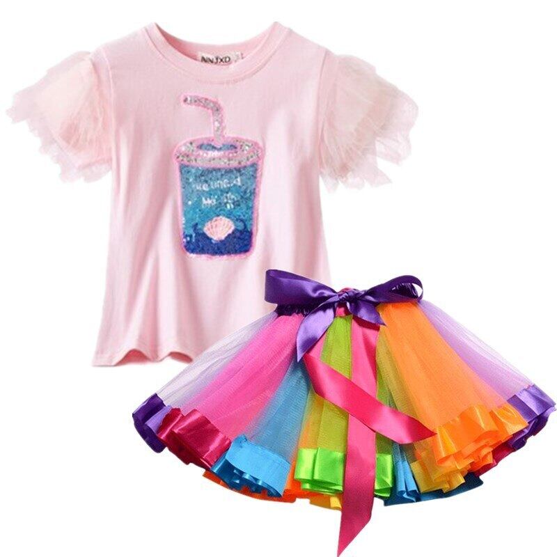 夏の女の赤ちゃん服セット漫画 Tシャツ + レインボーチュチュスカート 2 個子供スーツ 3 4 5 6 7 8 歳の子供