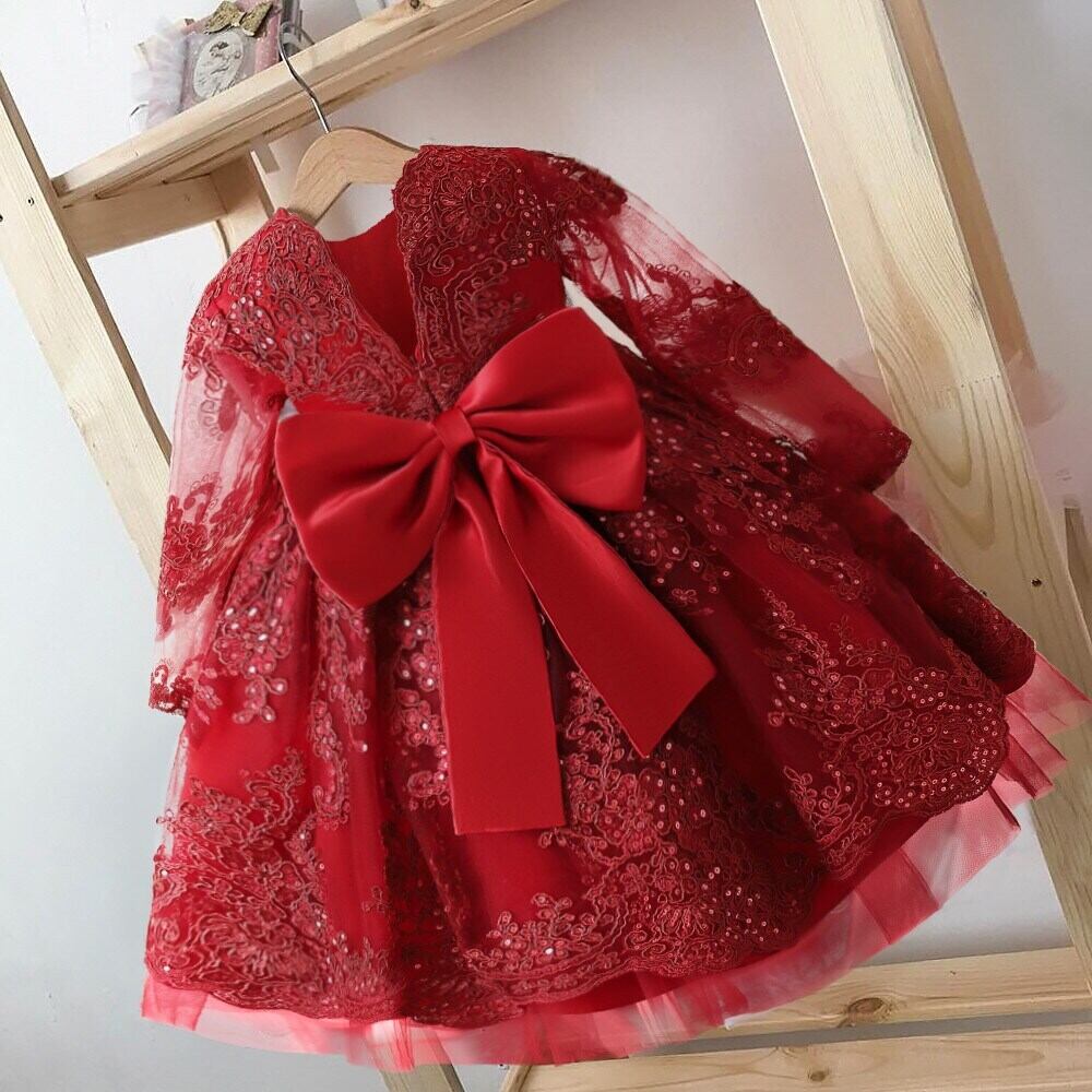 キッズパーティードレスクリスマス刺繍レース女の子結婚式誕生日ガラドレス長袖冬クリスマス年赤 Vestido