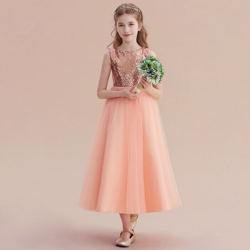 おしゃれ ピンク チュール スパンコール ジュニア ブライドメイド ガウン フラワー ガール ドレス 結婚式 イブニング 誕生日 コンサート ノースリーブ ロング